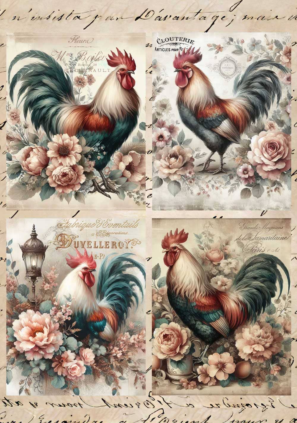 Galos em Flores Papel de Arroz para Decoupage