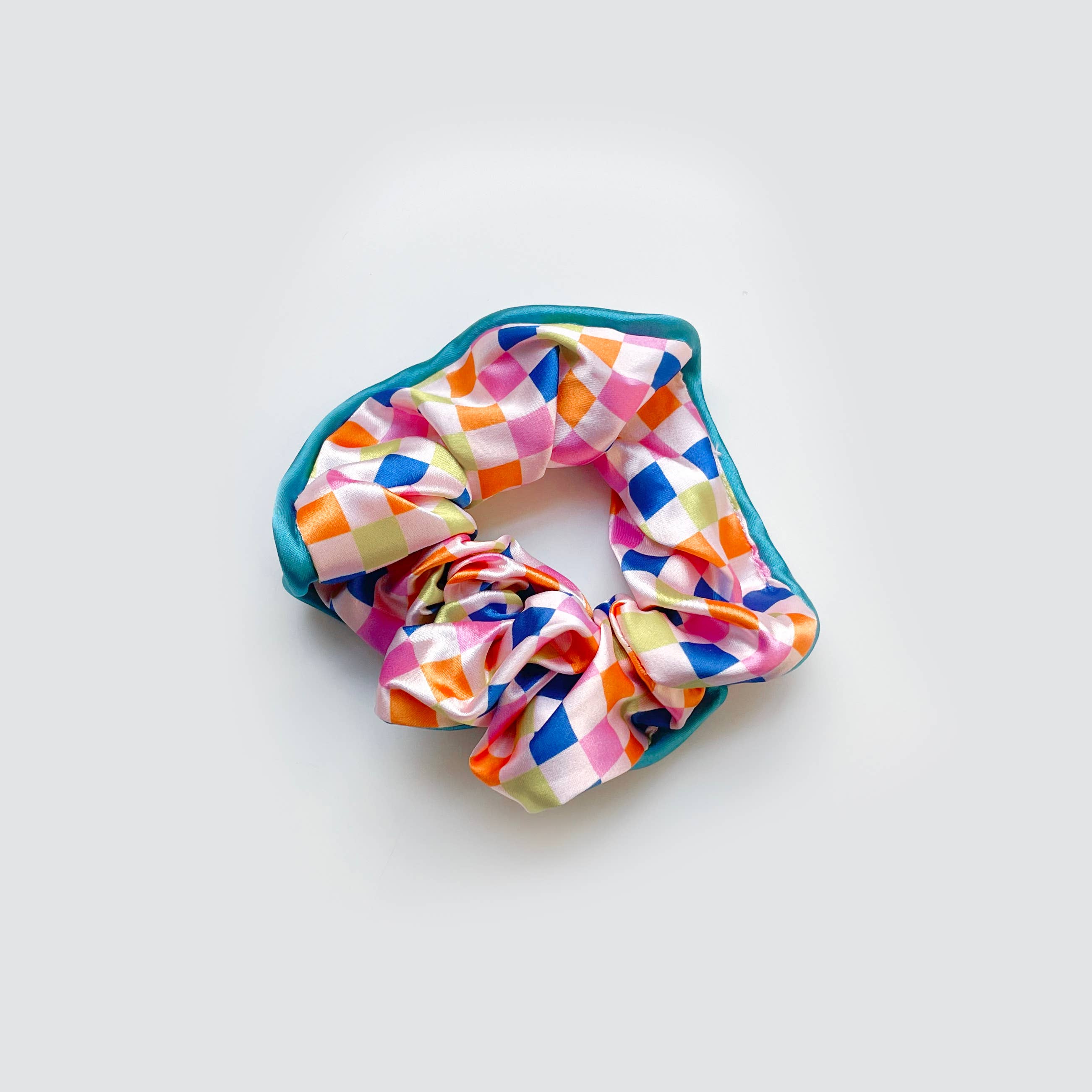 Scrunchie multicolor acetinado com tubulação Aproximadamente 5,11 polegadas de diâmetro sem alongamento. Eles podem enrolar o cabelo 2+ vezes dependendo da espessura do cabelo.