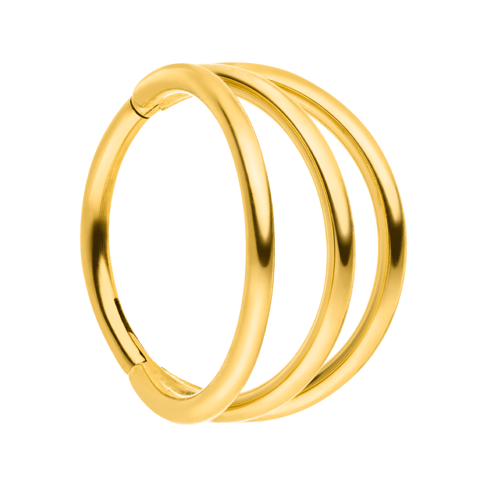 Anel segmentado triplo de alta qualidade com fecho clicker em titânio médico. O nosso piercing Triple Clicker pode ser usado como Conch (12mm) ou como Helix (8mm). Além disso, é antialérgico. As finas pedras de zircónia proporcionam um detalhe especialmente brilhante na tua orelha. Preferes algo mais discreto? Então o Triple Plain Piercing é perfeito para ti. * Preço para um piercing * Material: Titânio (ASTM F136), pedras de zircónia * Acabamento: Banhado a ouro amarelo 18K ou polido de alto brilho * Espessura da haste: Ø 1,2mm (16g) * 🚿 Resistente à água e sem níquel * Uso: Conch (12mm, 10mm), ou Helix (8mm)