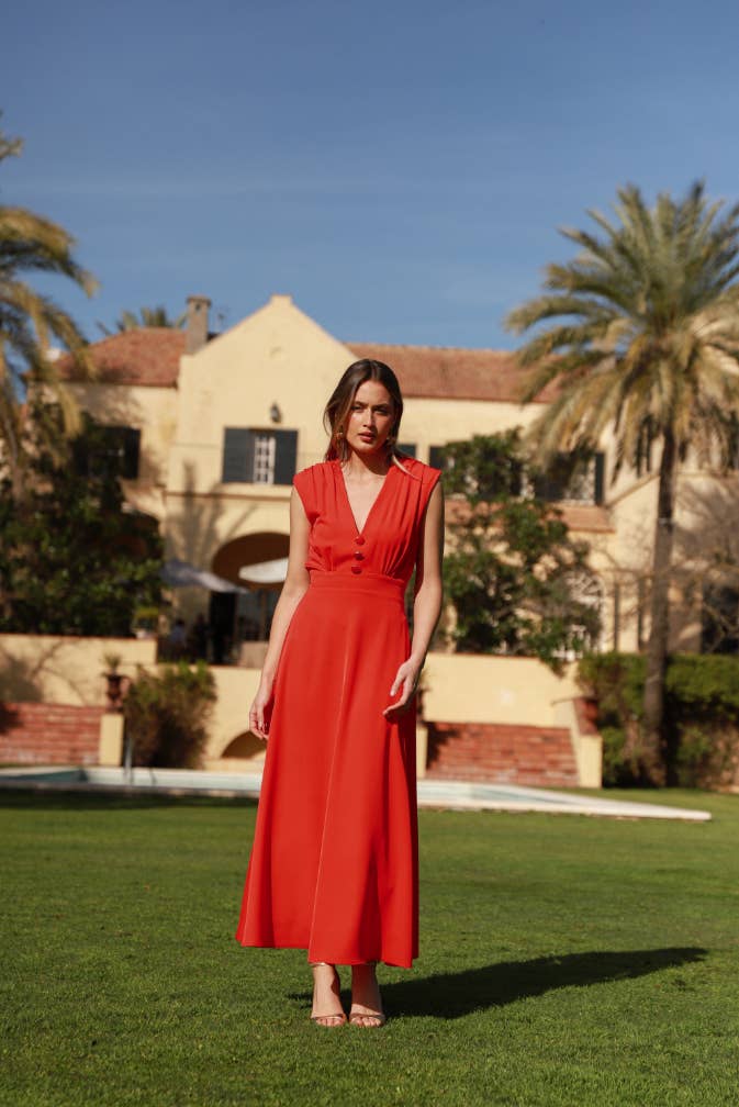 Vestido Grace com ombreiras em tecido de cetim. Detalhe de pregas nos ombros. Corte na cintura. Fecho invisível nas costas. - Convidada Perfeita Mulher Evento Celebração