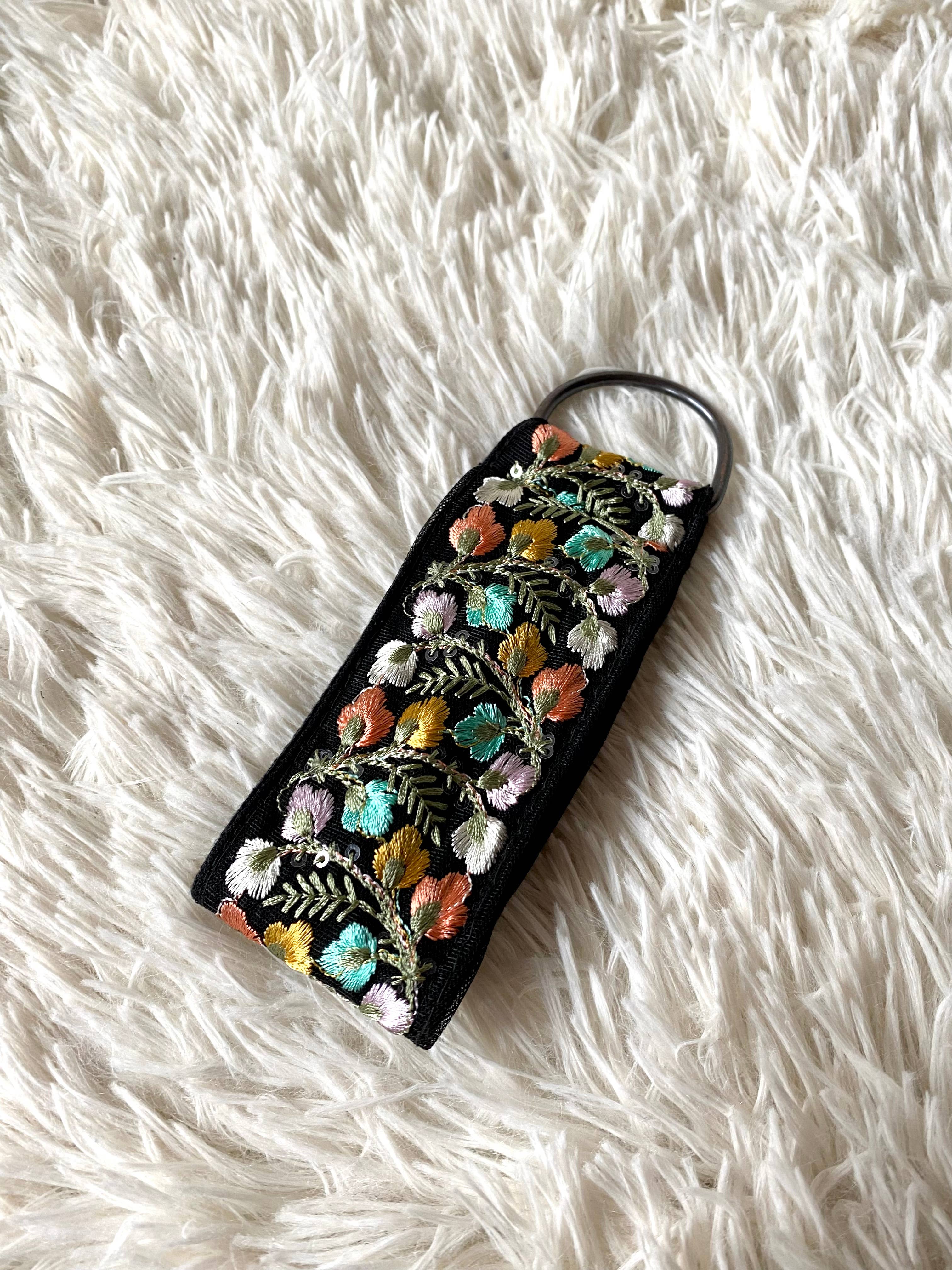 Chaveiro Floral em Preto com Estampa de Seda - Presente Exclusivo