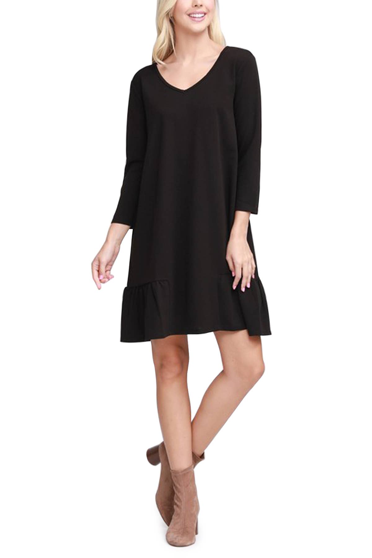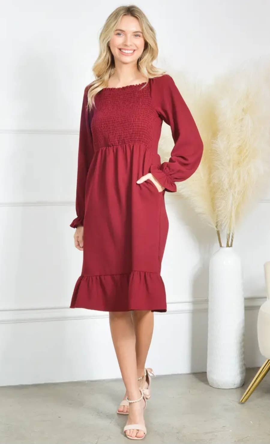 Vestido Midi em Crepe com Lastex, Mangas Bufantes Curtas e Babados