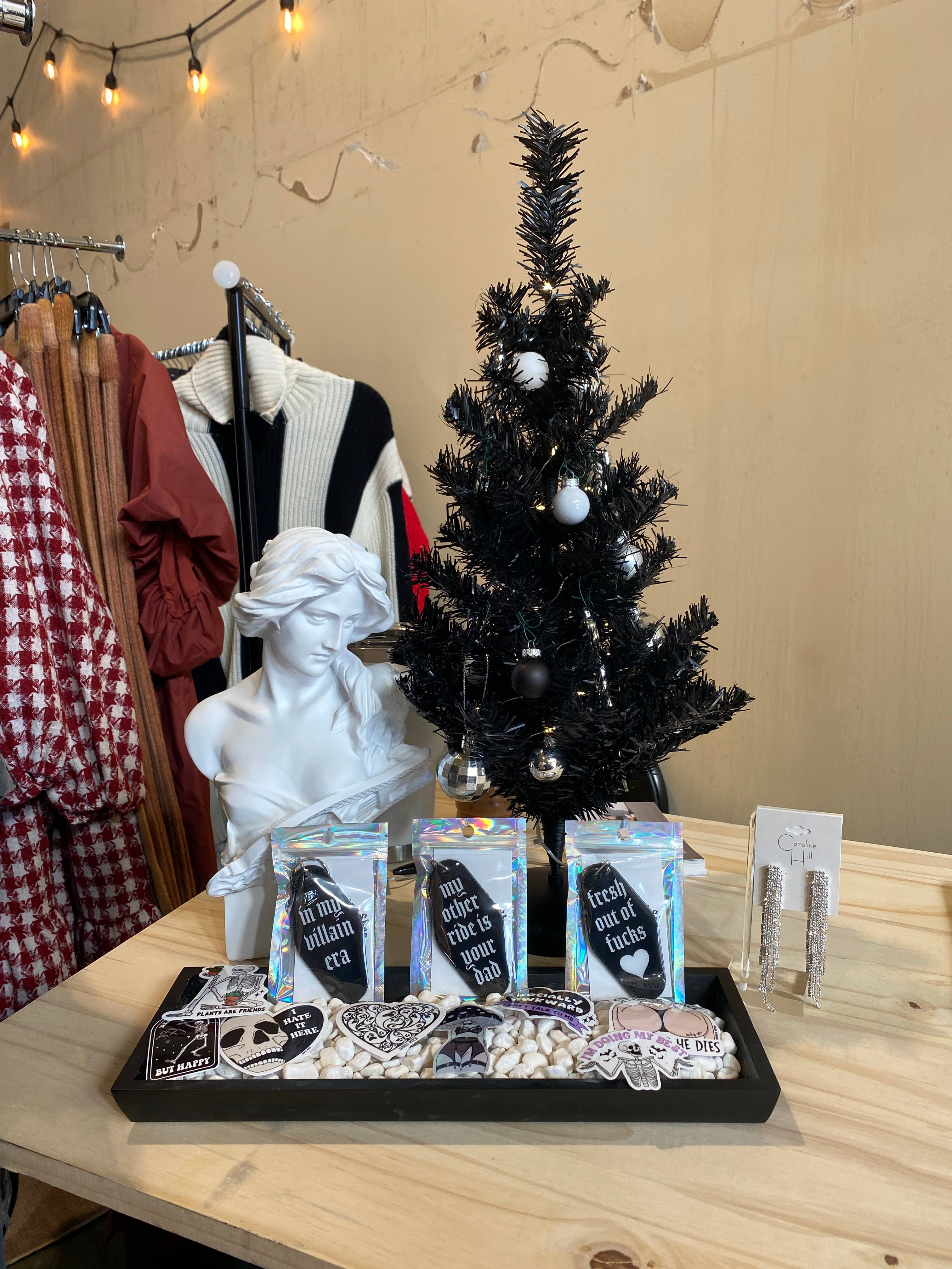 Adicione um toque ousado e ousado à sua linha de produtos com os nossos Chaveiros Black Motel. Estes chaveiros apresentam designs de vinil branco capinados à mão que misturam temas bruxo, gótico e ligeiramente ofensivo, todos selados com resina UV para maior durabilidade. Cada chaveiro vem com um porta-chaves robusto e é embalado numa bolsa holográfica com a nossa marca, tornando-os perfeitos para atrair clientes que apreciam acessórios únicos e provocantes. Material: Base de plástico preto de alta qualidade proveniente da China e produto final feito à mão por nós no Canadá. Selo: A vedação de resina UV fornece um acabamento brilhante e durável que protege os designs intrincados do desgaste. Porta-chaves: Porta-chaves de metal resistente acoplado para uma utilização fiável. Embalagem: Cada chaveiro é embalado individualmente numa bolsa holográfica, adicionando apelo visual e proteção durante o transporte. Inclui uma etiqueta de marca para fácil identificação e exibição.