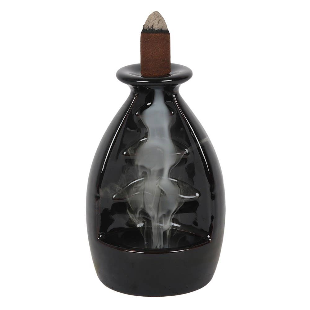 Um queimador de incenso de backflow simples mas bonito em um design de rio de cerâmica preta fluindo. Quando o cone é aceso, a fumaça das cascatas do cone para baixo em um efeito hipnotizante de cascata para a piscina na parte inferior. Lindo para ver. Para melhores efeitos, queime dentro de casa numa área afastada de quaisquer movimentos de ar repentinos. Tenha em atenção que, após a queima, é normal que apareça um resíduo oleoso leve no queimador de óleo, por este motivo recomendamos proteger qualquer mobiliário sobre o qual é colocado adequadamente. O resíduo pode ser facilmente limpo do queimador com um pano húmido. Por favor, tenha cuidado ao queimar incensos. Somente cones de incenso de backflow devem ser usados com este produto — os cones de incenso padrão não criam o efeito desejado. É normal que os cones demore até 10 minutos depois de serem iluminados para começar a criar o efeito fumador/névoa. Fornecemos uma seleção de cones incensos de backflow numa variedade de aromas.