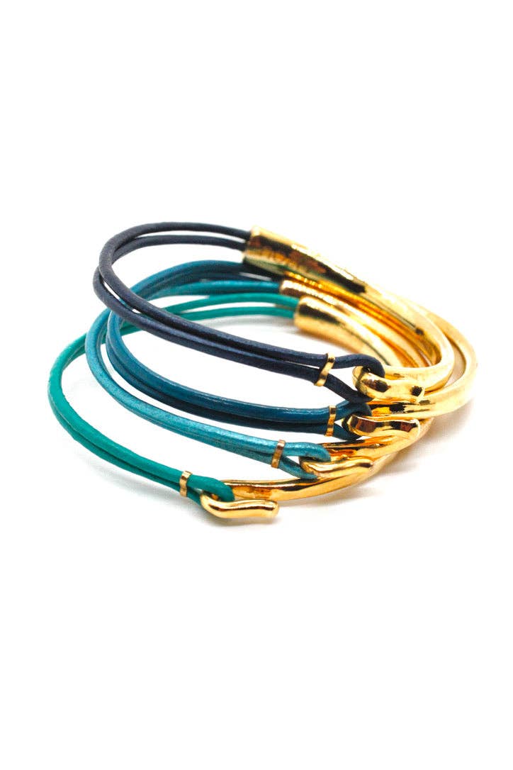 Uma bela combinação de 4 pulseiras com várias tonalidades de couro vermelho. Materiais: Metal banhado a ouro 18k e couro genuíno.