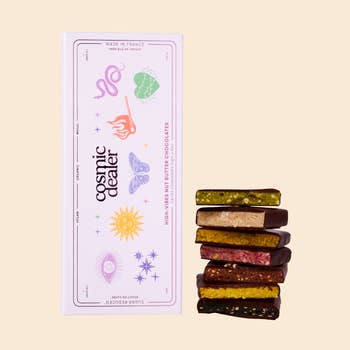 Kaju Katli: castanha de caju, cana-de-açúcar, cardamomo, manteiga de cacau, pó rosa (vegan, sem glúten)