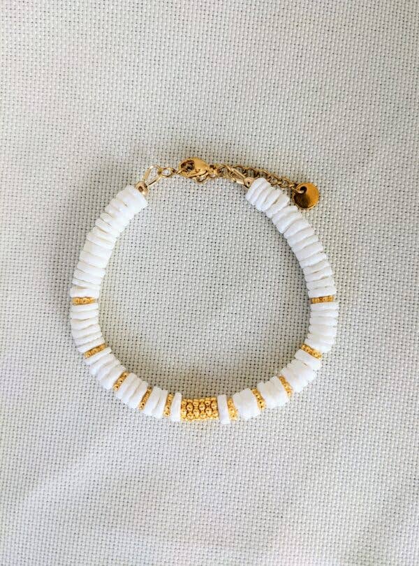 Pulseira MYKONOS com contas de conchas brancas e douradas feitas à mão