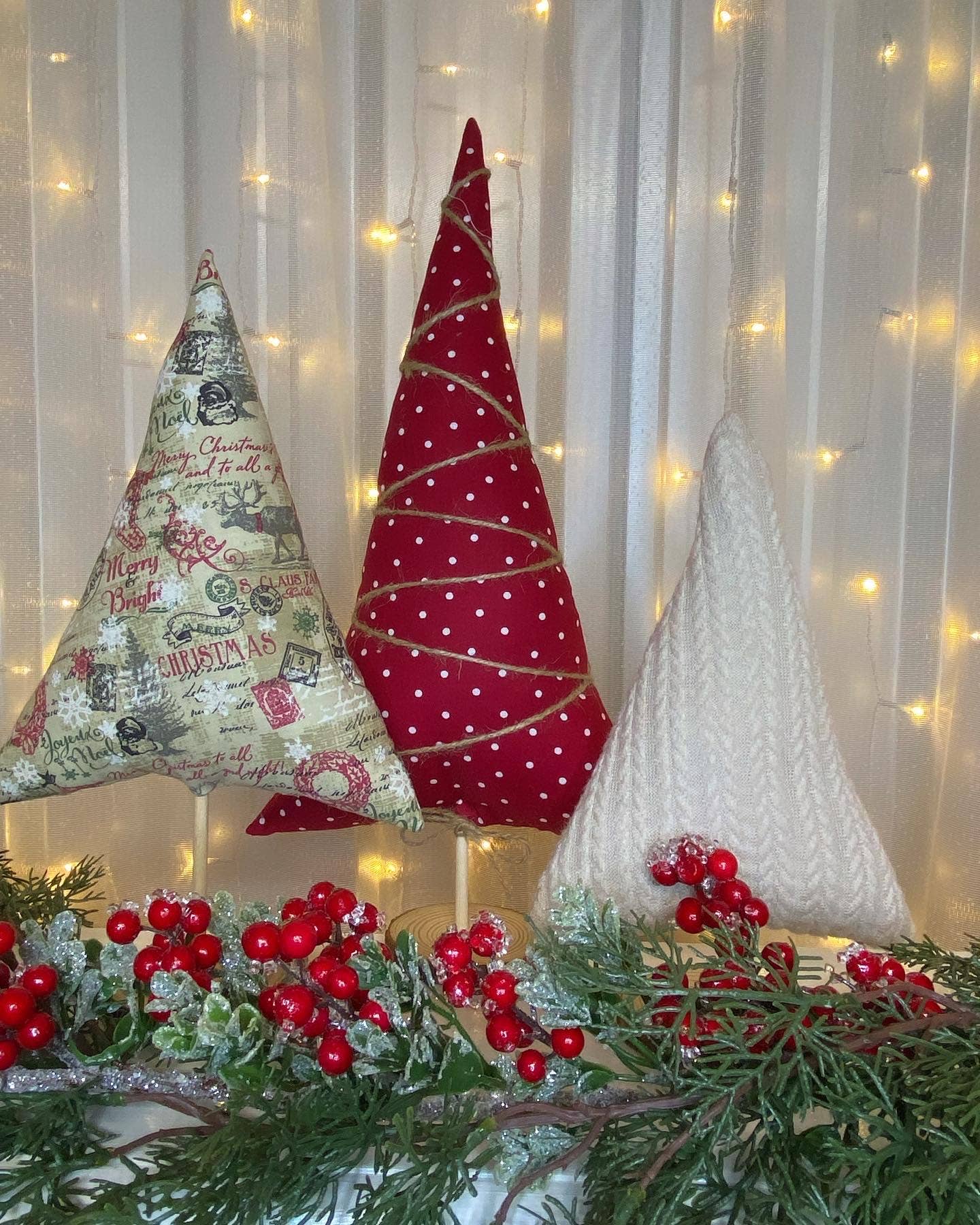 Conjunto de 3 Árvores de Natal de Tecido com Estampa Vintage