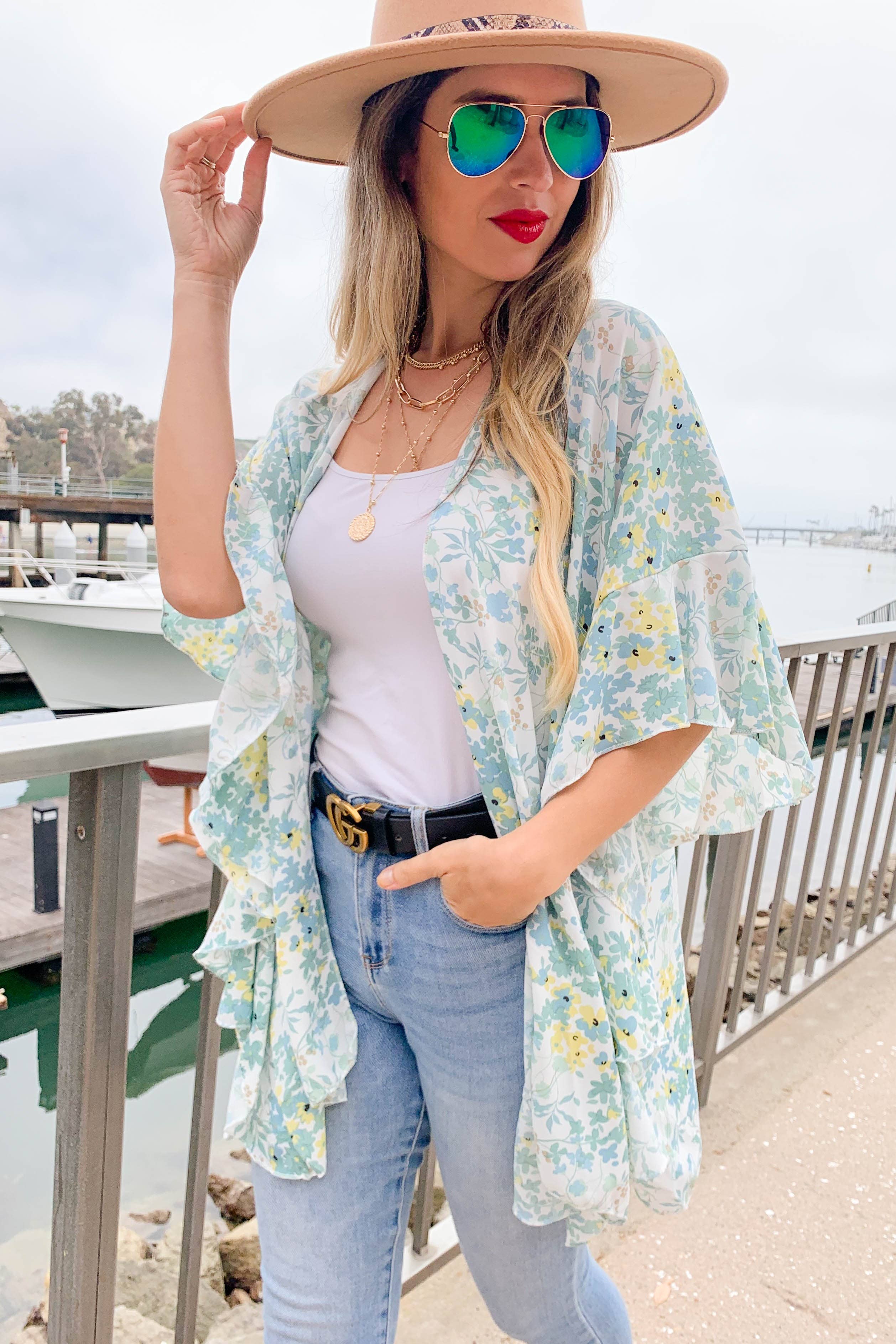 Kimono Cardigan com Estampa Floral Oliva e Detalhe em Renda 3/4