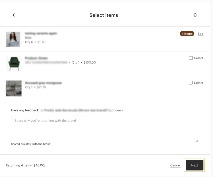 - Select the quantity of each item that you want to return and a reason for the return. Then, confirm the return total.