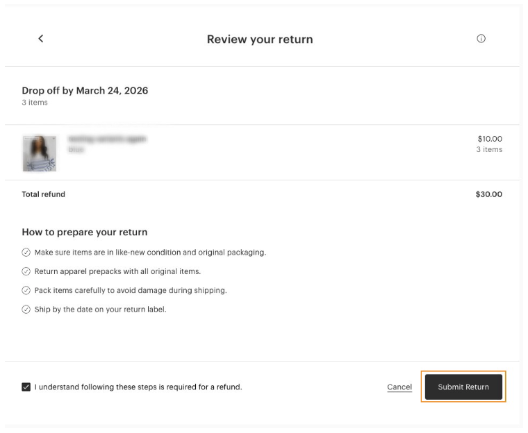 Acknowledge & agree to our return policy and select Submit Return.