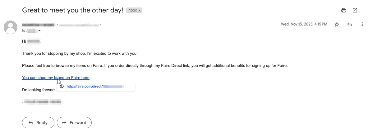 You encouraged the retailer to order through your Faire Direct link, and they responded |