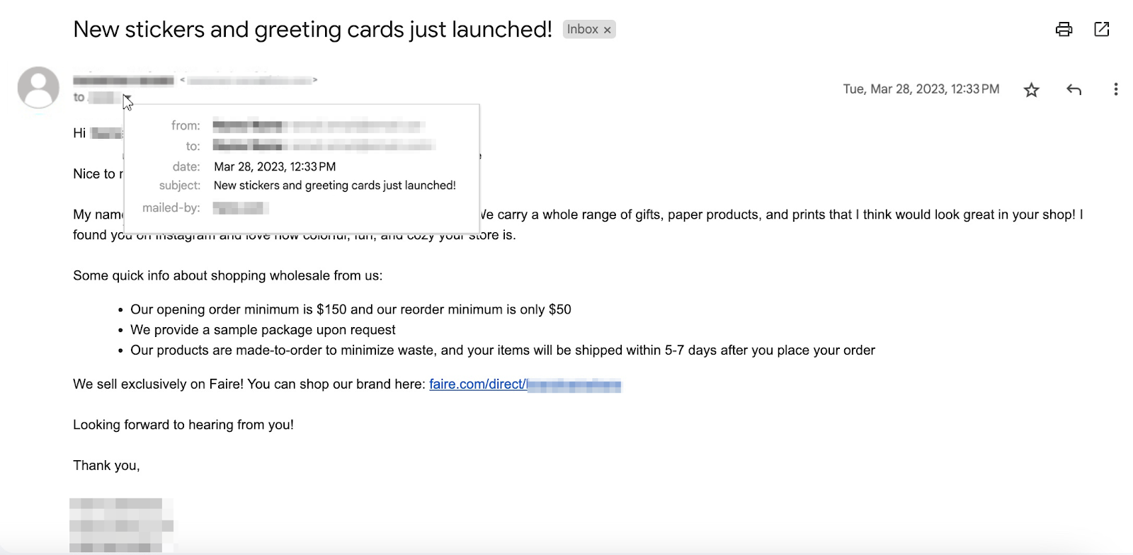 You encouraged the retailer to order through your Faire Direct link, and they responded* |