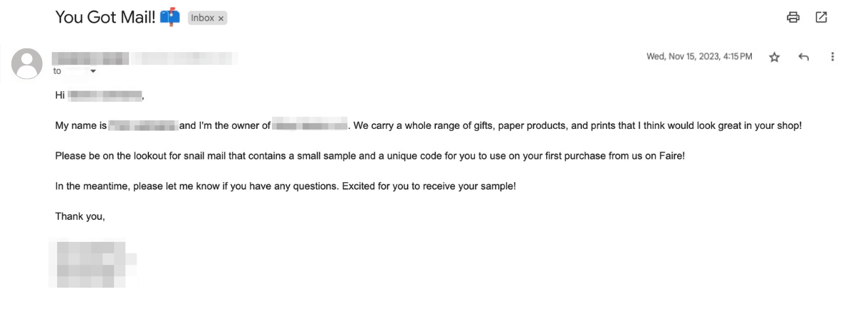If the retailer has reached out to you first, be sure to include your response in your screenshot showing that you encouraged the retailer to order from you through your Faire Direct link