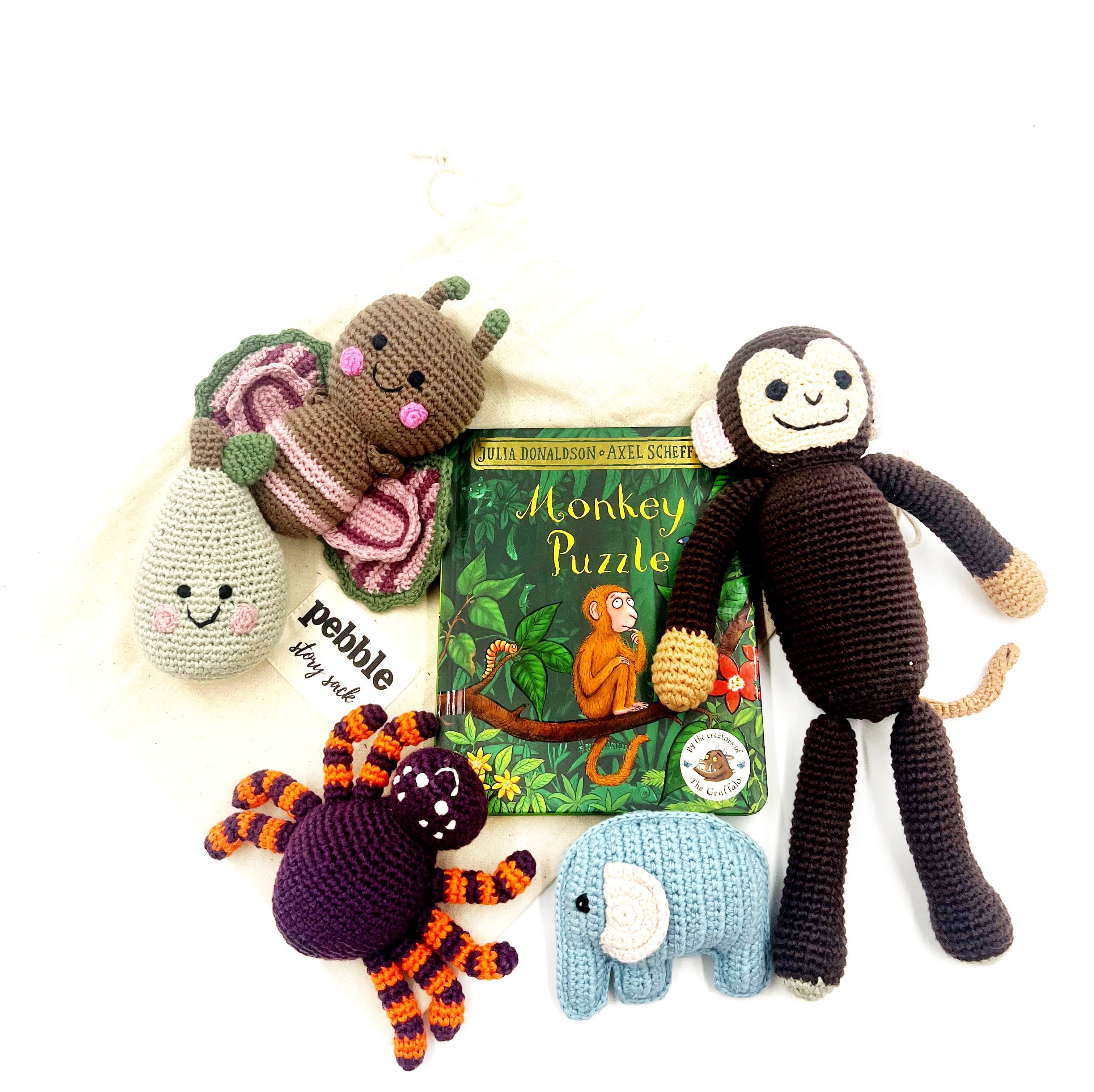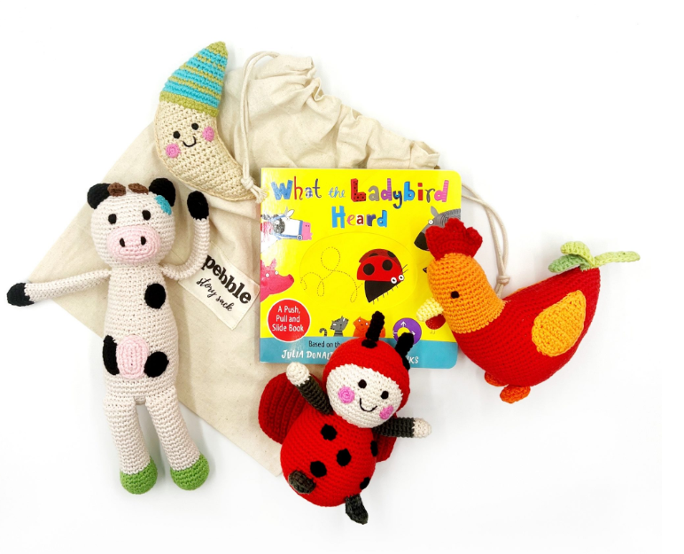 Pebble gör vackra leksaker och skapar värdig sysselsättning på landsbygden i Bangladesh. Alla Pebbles produkter är helt handgjorda och rättvisemärkta. Vi strävar efter att tillhandahålla sysselsättning som passar in i rytmen i landsbygdslivet, stoppa strömmen av ekonomisk migration till städerna, och hålla familjer tillsammans. Tillsammans hjälper vi kvinnor ur fattigdom och sätter leenden på ansikten över hela världen! Pebbles härliga leksakskollektion för barn i åldrarna 0-10 innehåller vänliga frukter och grönsaker, söta djur, dragleksaker, sagobokskaraktärer, dinosaurier, djur under havet, safari, gårds- och skogsdjur och mer. Varje Pebble-leksak, designad i Storbritannien, garanterar förstklassig kvalitet och säkerhet och erbjuder perfekta följeslagare för ditt barns lekäventyr.