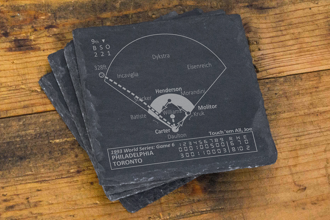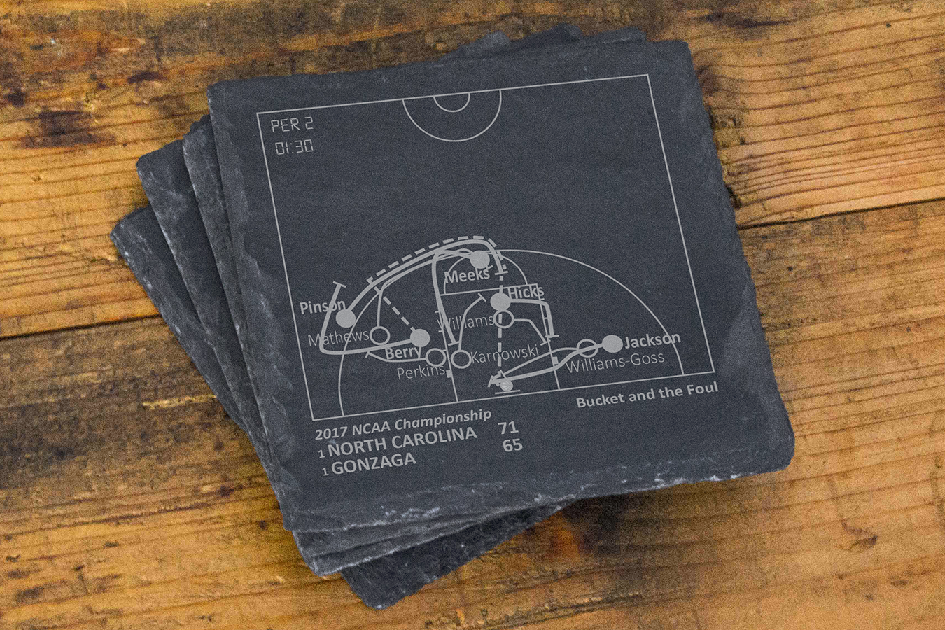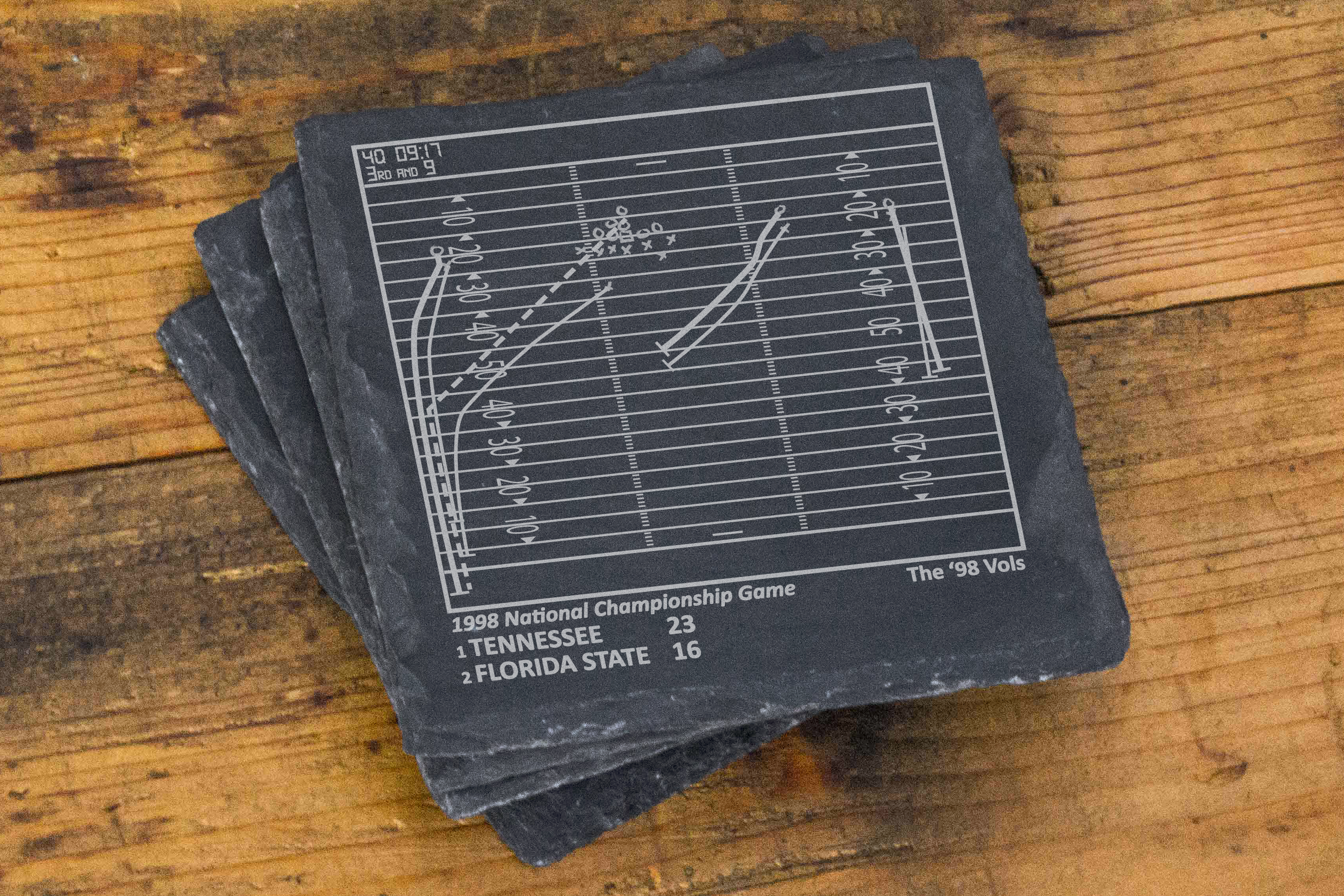Som sportfans har vi alla våra favoritspel. Dessa spel handlar lika mycket om oss - fansen - som de handlar om lag och spelare. Vi kommer alltid att minnas vad dessa stunder betyder för oss. Var och en av våra produkter berättar en historia, en som du kan dela med dina gäster eller återuppleva när du väntar på att en match ska börja. Detta företag började med en uppsättning skifferunderlägg som var en gåva till min brors 30-årsdag. Med honom 3000 mil bort får vi inte ofta chansen att titta på matcher tillsammans, men sport har alltid varit ett starkt band mellan oss. Jag undersökte de viktigaste ögonblicken i hans lags historia och diagrammade pjäserna så att han kunde återuppleva dem varje gång han satte sig vid sitt soffbord. Med mer än 14 000 femstjärniga recensioner... har vi vuxit till ett varumärke som kunderna älskar och litar på. ** MEDDELANDE: Ingen sportspelare, lag, liga eller playoff är ansluten till Playbook Products™ eller är källan till, ansvarar för eller har godkänt, sponsrat eller godkänt dessa produkter. **