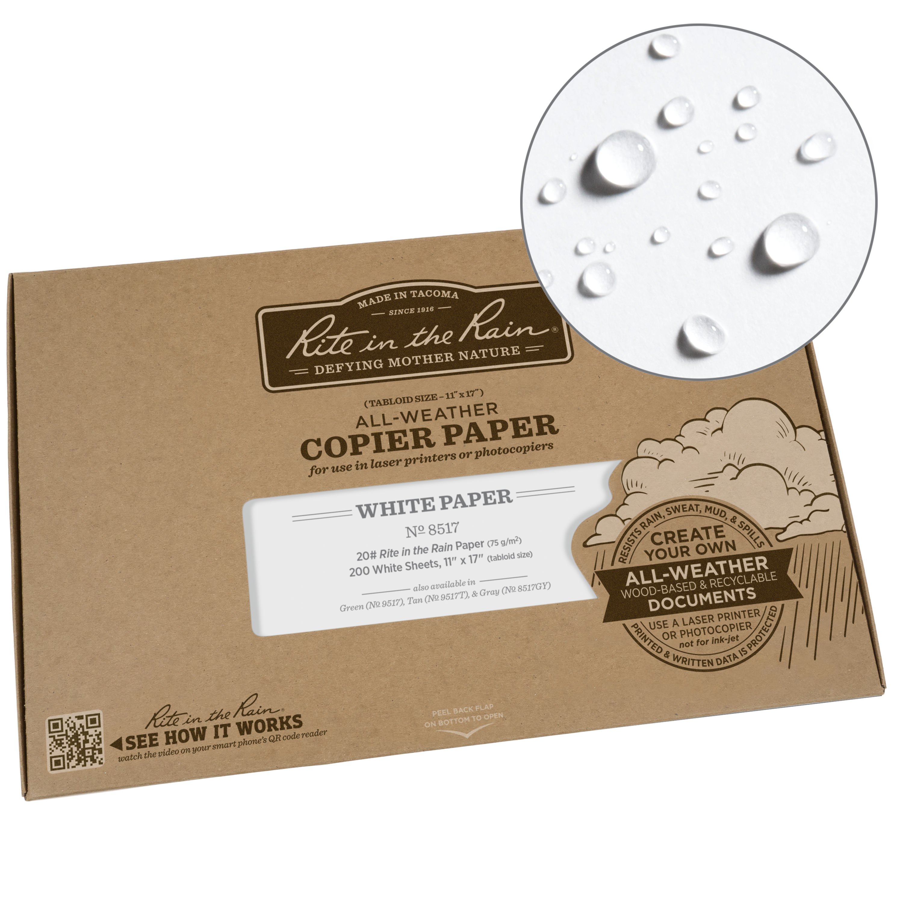 Rite in the Rain är ett varumärke som är född för att uthärda vad andra skrivprodukter inte kan. Från kontoret till Mt. Everest, vi tillåter anteckningsdeltagare, observatörer och skapare att tända tankar var som helst. Rite in the Rain grundades utifrån ett behov av att skydda det som är viktigt. Vårt träfiberpapper har en speciell beläggning som stöter bort vatten, olja, snö, kaffe, lera, mjölk och andra element som förstör vanligt papper. Tillsammans med en arkivklasssamling av anteckningsböcker och papper, Vi erbjuder också ett urval av skrivinstrument som kan tåla lika mycket. Vi är fast beslutna att producera de mest hållbara skrivprodukterna som kan användas var som helst.
