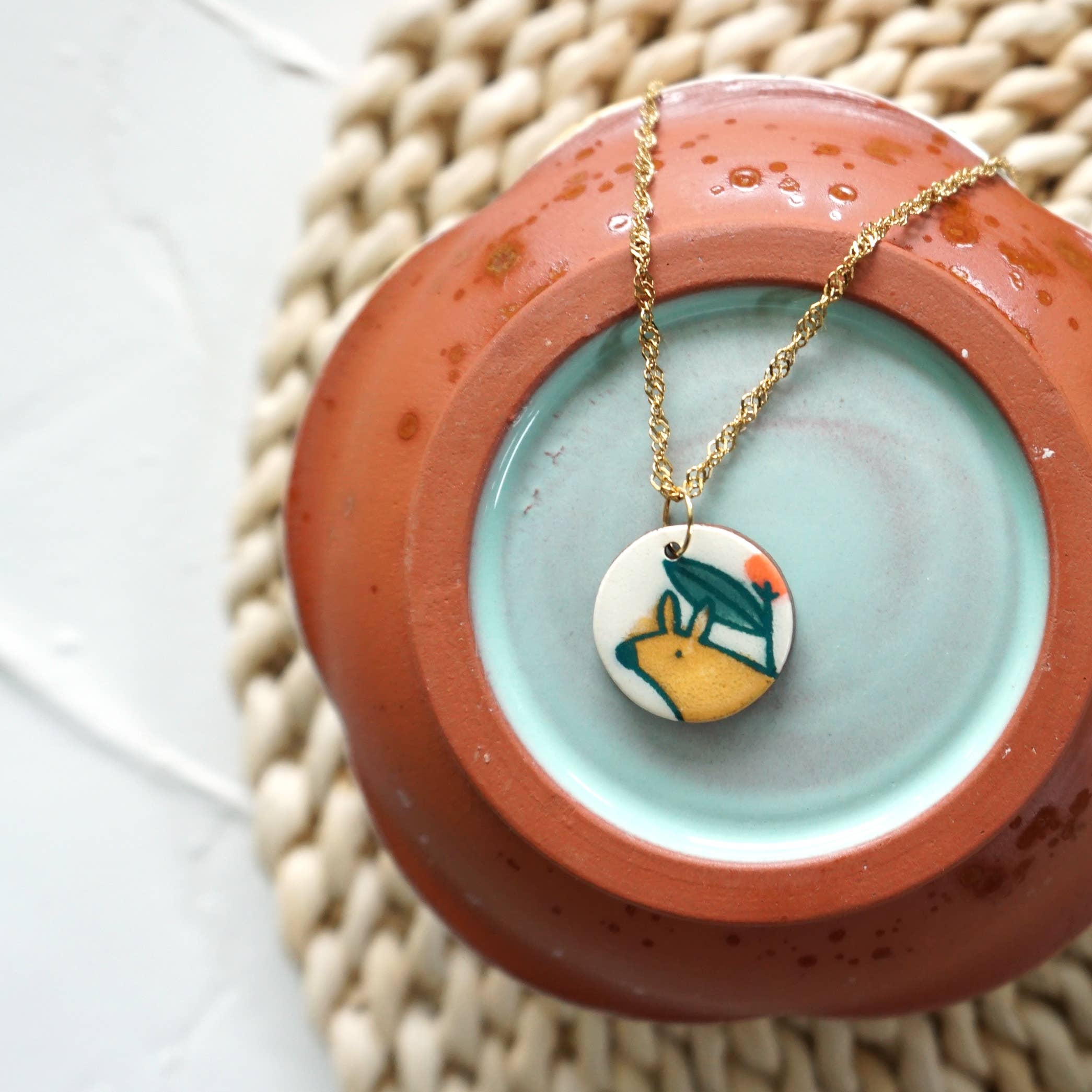 Jag heter Catie. Jag designar, illustrerar och gör varje bit från min hemmastudio för att skicka till snygga, eklektiska butiker runt om i världen. Mitt arbete känns igen av de ljusa färgerna och lekfull mönstring. Jag använder en metod som kallas glidöverföringar. Det jag älskar med processen med glidöverföring är att det kombinerar mina intressen för att rita, grafik, målning, och lera. Genom att screena skriva ut mina egna ritningar på tidningspapper kan jag replikera komplexa mönster samtidigt som jag håller allt handmålat. Jag älskar de spontana överföringsmärkena för veck och rynkor på det glidtäckta papperet samt felregistrering av linje och färg, ger en inblick i hur det görs. Smycken är gjorda av terrakotta, som är ömtålig och tar lite extra omsorg. Det rekommenderas att bära örhängen med proppar på krokar för att undvika att de faller ur örat när du rör dig och skakar hela dagen eller natten. Örhänge trådar är 14k guldpläterade 925 sterling silver medan stud inlägg är kirurgiskt rostfritt stål. En glänsande glasyr täcker framsidan av örhängena. Baksidan av örhänget är terrakotta med ett subtilt mönster.