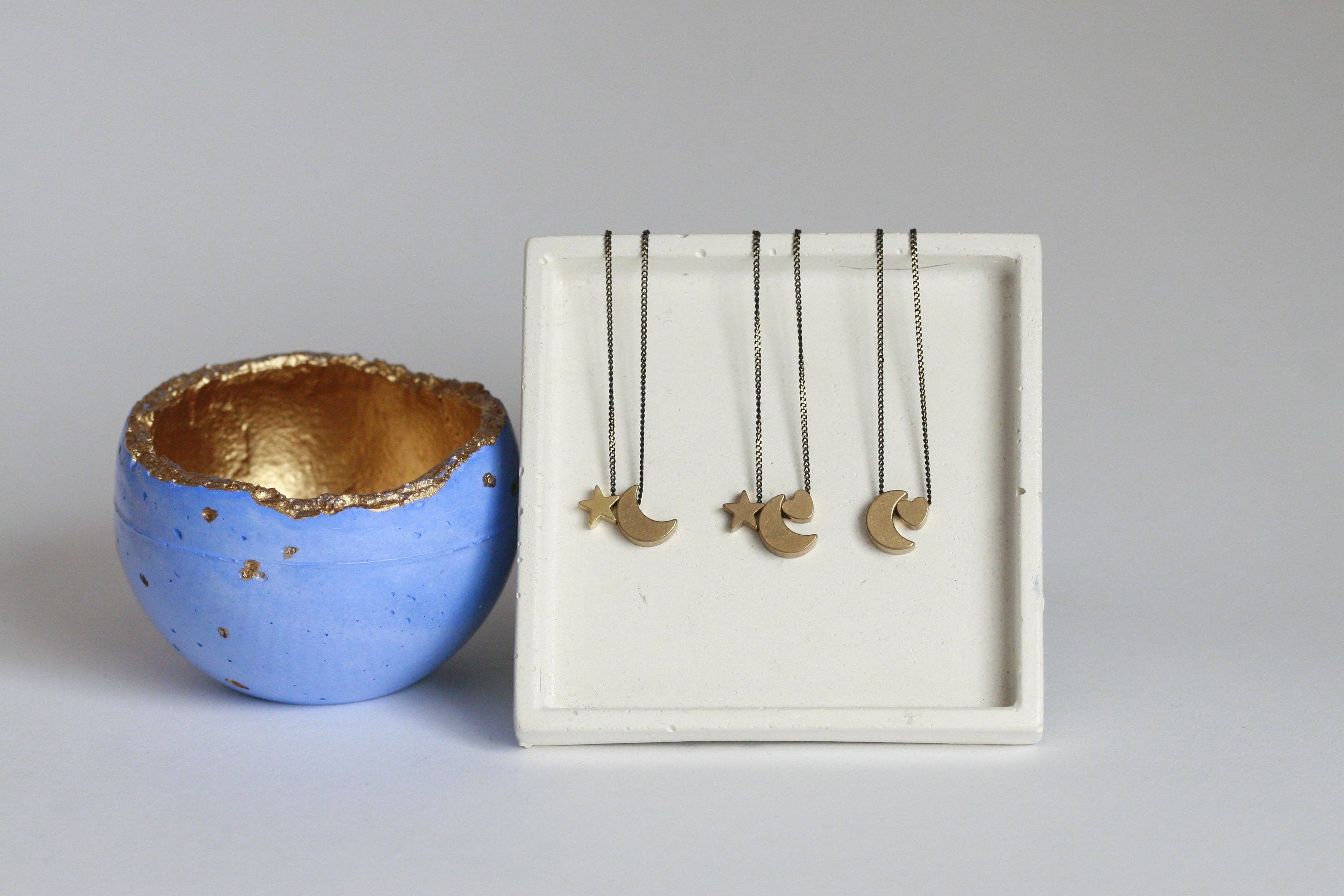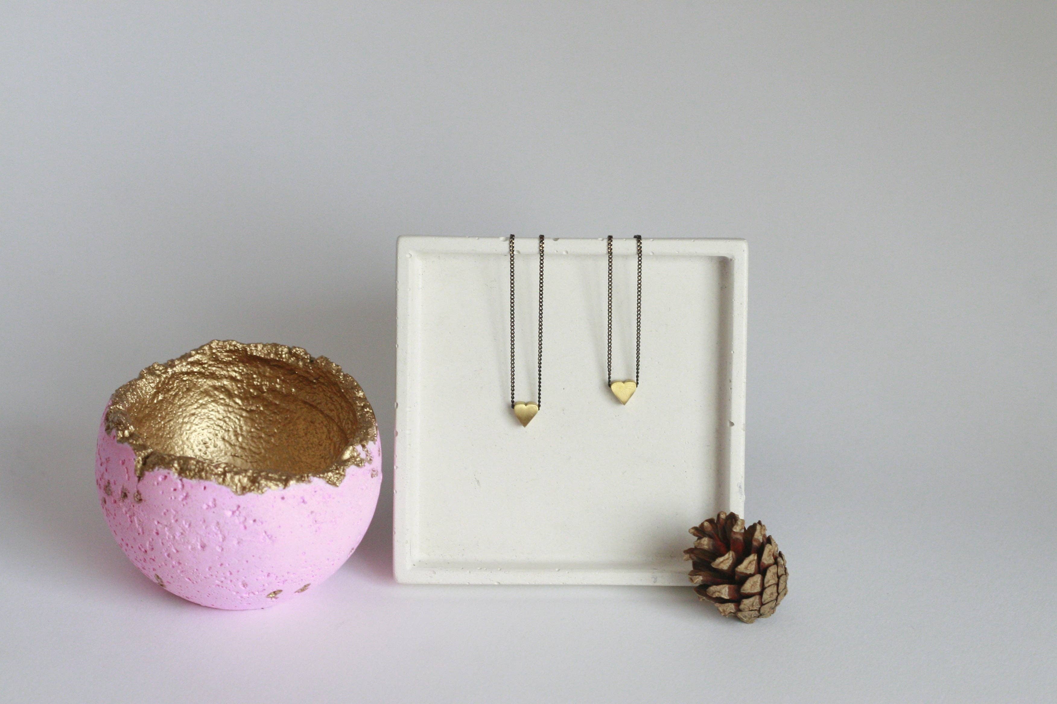 Kaïkø Studïø Samtida, jordnära och industriella betongtillbehör, belysning och smycken designade och handgjorda i Wicklow, irland. Vilka vi är: Linda & Maciej, vår bakgrund är inom inredningsarkitektur och betongkonstruktion och vi älskar båda vandringar runt Wicklow, vi är fascinerade av helig geometri och vi brinner för ett holistiskt och hållbart liv. Start av verksamheten: I november 2016 grundade vi moderna hemtillbehör och möbeldesignföretag Kaïkø Studïø. Och några månader in började vi också experimentera med smyckedesigner med samma industriella material. Konstruktioner och produkter: Vi arbetar mest med betong, harts och mässing; våra mönster är naturinspirerade och organiska i harmoni med arkitektoniska och geometriska. När vi bodde i Dublins centrum var påverkan från stadsmiljön mycket synlig i våra mönster med rena symmetriska linjer och monokrom palett. Men sedan vi flyttade till Bray, Co Wicklow, vi känner definitivt en förändring till mer organiska mönster med subtila färgpoppar.