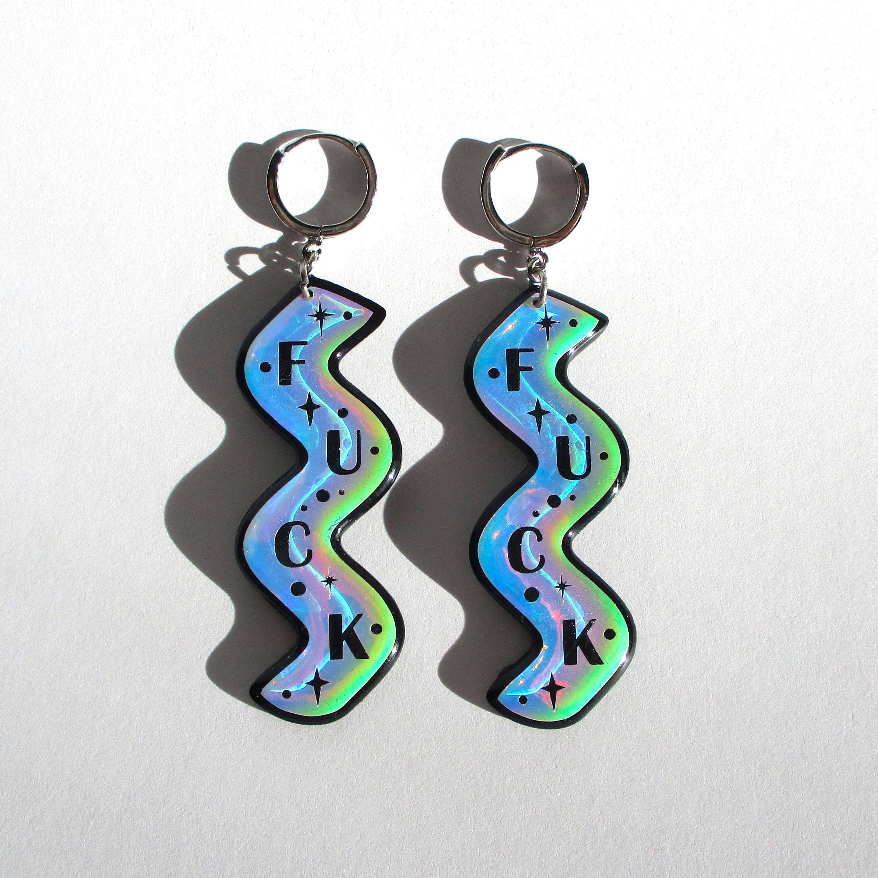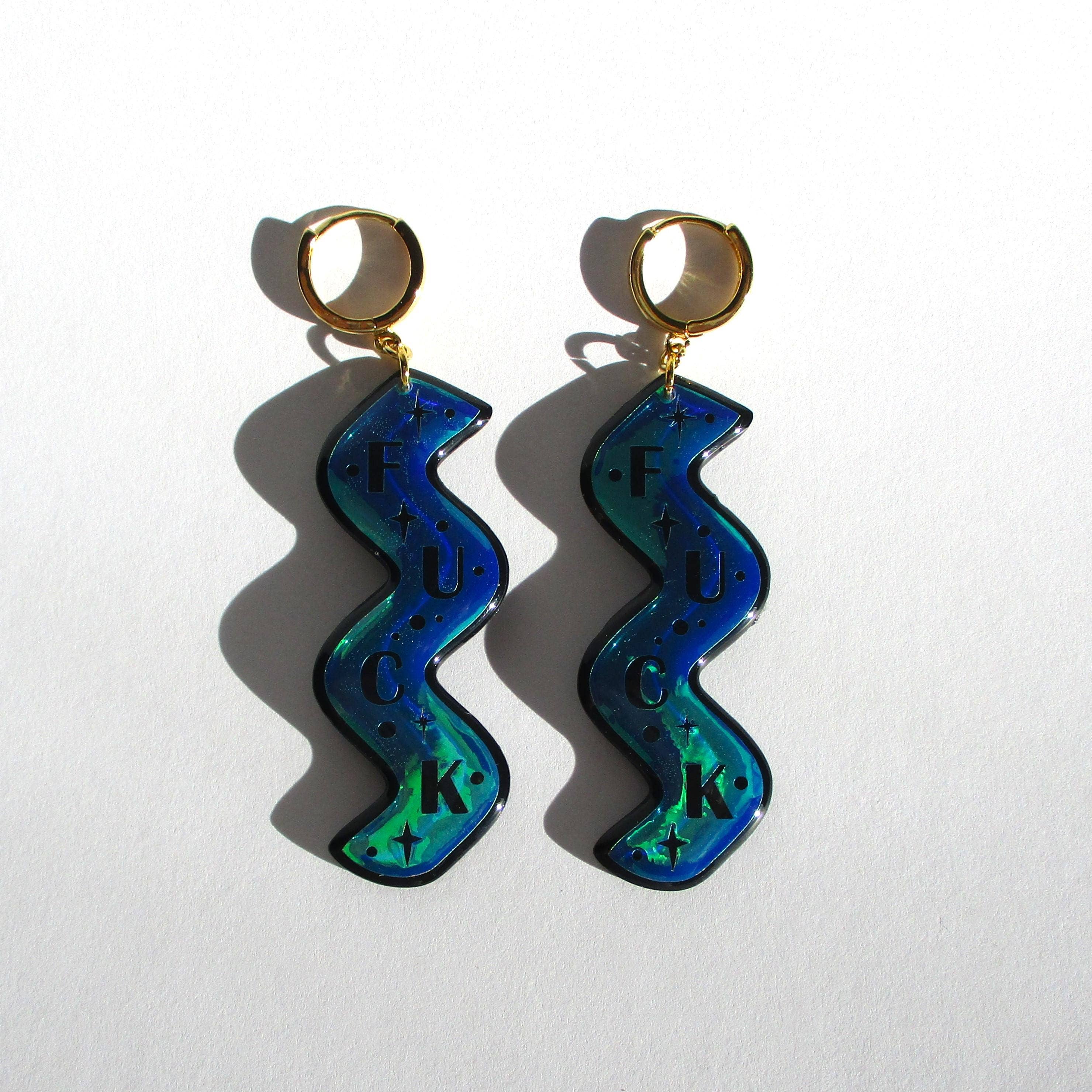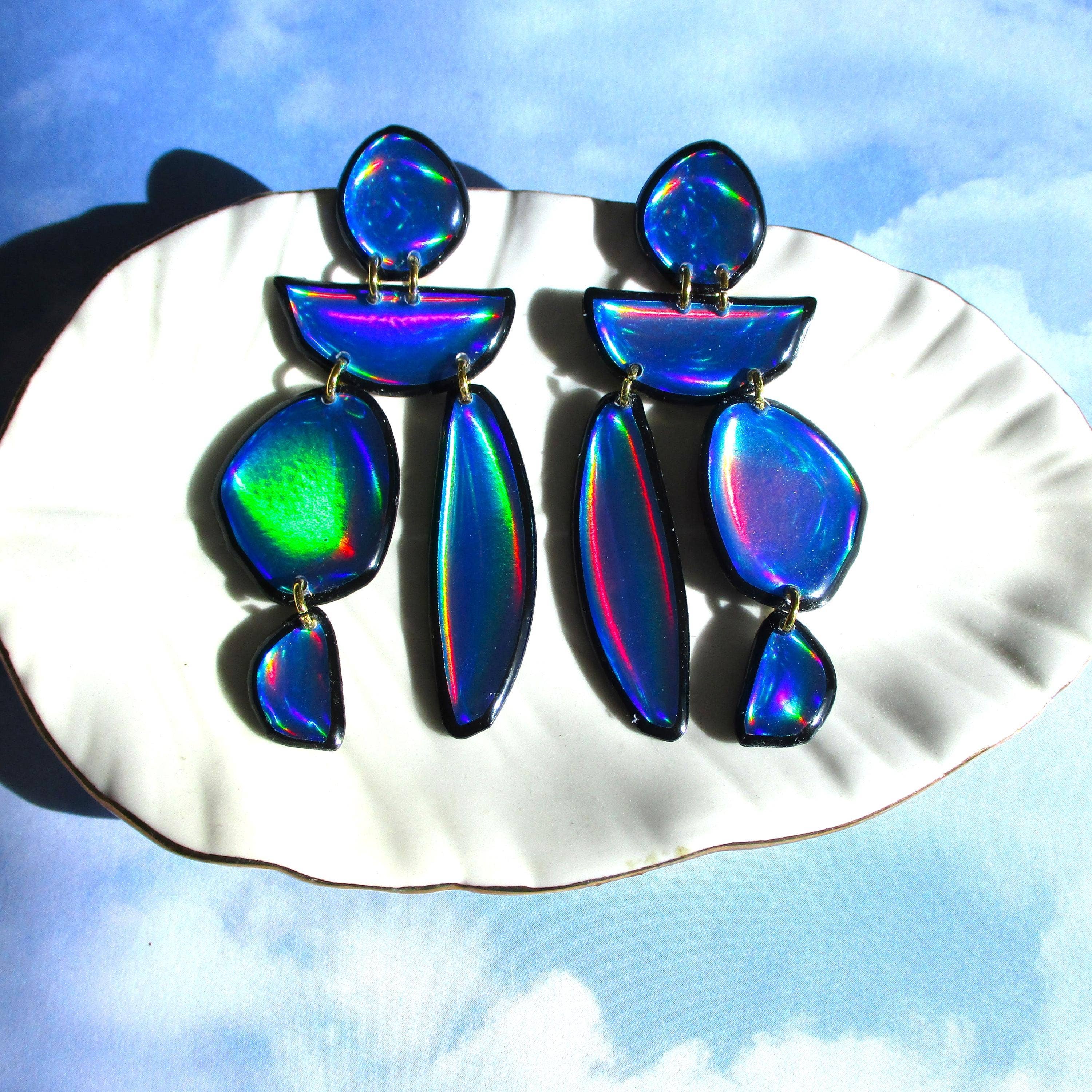 Att skapa min juvelinje Wuve har blivit ett sätt att uttrycka mig i världen idag. Det är något magiskt med att kunna ta ett tomt papper och ett par vätskekannor och förvandla dem till fantastiska små konstsmycken. Jag ser utåt för färginspirationer, tar inflytande från natur och mode. Min konst har gett mig ett sätt att få kontakt med människor och få lite nyckfull till deras vardag. Bara en liten inblick i min process för dig... Jag målar ett originalkonstverk. Jag skar upp den för hand. Jag harts fram- och baksidan av varje bit flera gånger. Jag städar sedan upp och sandar varje bit. Sedan borrar jag och fäster hårdvara på varje bit för att göra ett komplett smycke. Varje smycke som jag gjort är ett speciellt konstverk, en representation av var jag befinner mig i livets konstnärliga resa. Processen att göra dessa örhängen tar 5 dagar, med flera steg i den process som jag har upptäckt och fulländat under det senaste decenniet.