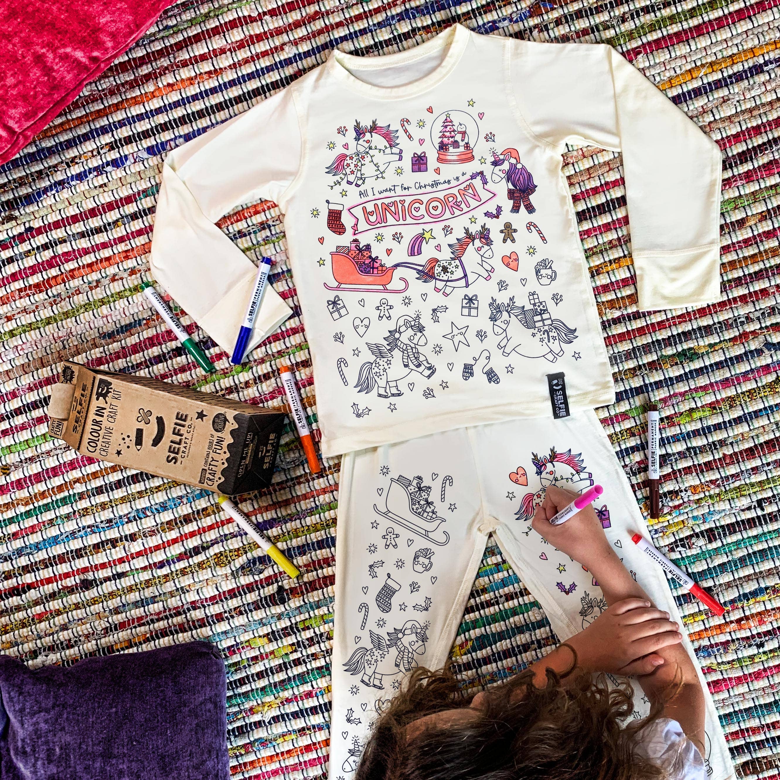Kul, kreativ och inlärning i varje färg i set! Välkommen till Selfie Craft Co, ett varumärke för kreativa barn som älskar att göra. Gemma skapade sitt unika företag, Selfie Craft samtidigt som hon tog tid bort från sitt heltidsjobb för att ta hand om sina två barn. ”Idén om färg i kläder kom från mina egna pojkar, och deras kärlek till hantverk. Jag ville utöka den stolthet och känsla av prestation de får från att göra saker och ting, och vilket bättre sätt finns där än att låta dem bära det de har gjort!” säger Gemma. Allt började med lanseringen av deras super soft jersey toppar, handtryckta på beställning med en mängd olika mönster, som kan anpassas, att inkludera enhörningar, dinosaurier och superhjältar. På baksidan av denna framgång utökades sortimentet med lanseringen av färg-i-pyjamas, hattar och klä upp uddar. ” Vi håller ständigt utkik efter nya trender och teman. Eftersom vi är ett brittiskt företag och designar allt själva kan vi vara ganska lyhörda och lansera regelbundet ny design”, säger Gemma. Varje föremål levereras med en uppsättning permanenta tygpennor som innehåller högkvalitativt UV-bläck, utmärkt för färglivfulla färger, vilket uppmuntrar barn att utforska en mängd olika tekniker. Pennorna är också professionellt testade för att säkerställa att de inte tvättas ut. Permanenta pennor är hörnstenen i produkten: barn kommer att lägga mycket tid och ansträngning på sin skapelse - även om de går utanför linjerna och T Rex blir rosa!