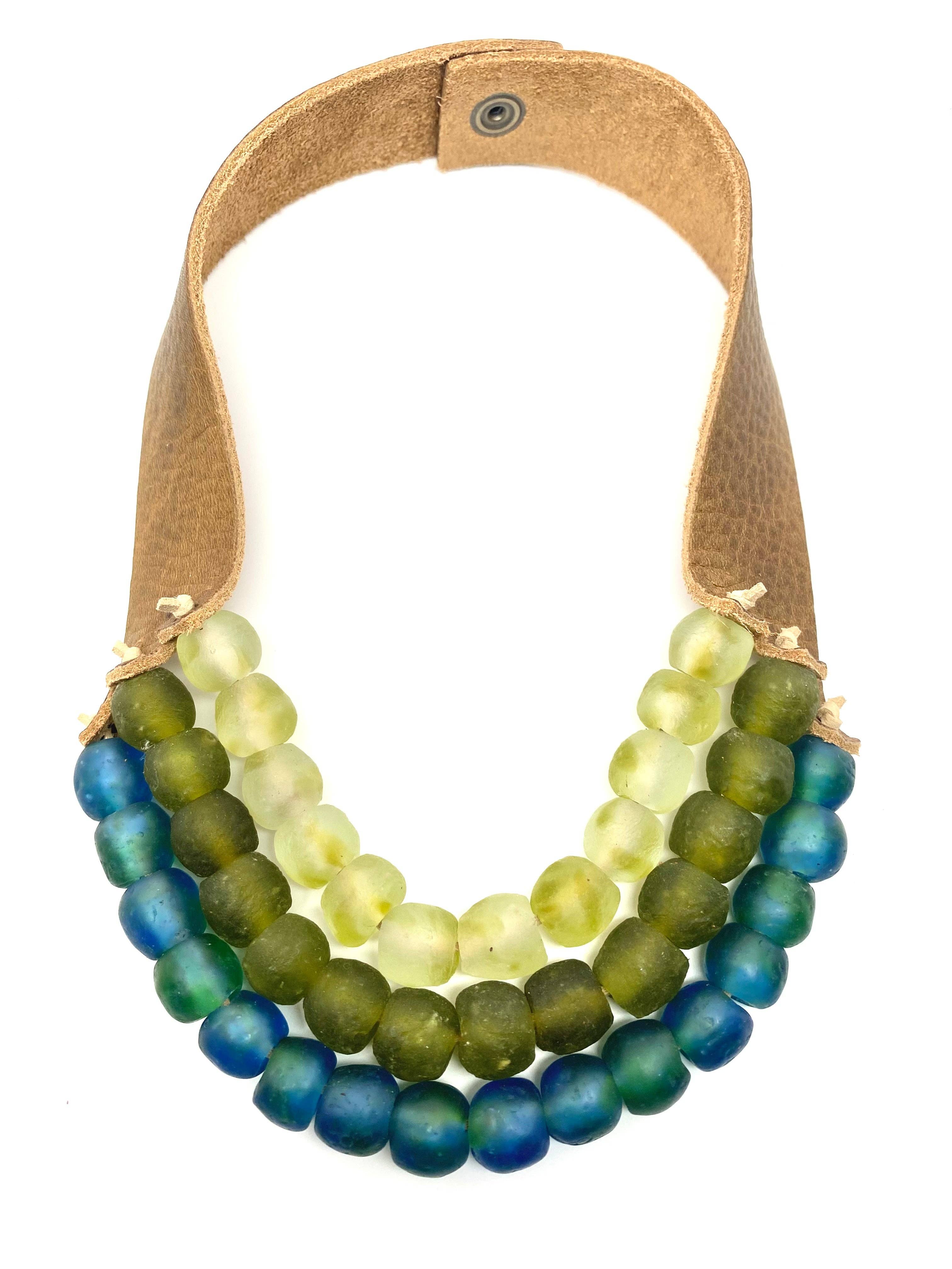 Varje bit är helt ny - som ett nytt par skor att bryta in - pärlarbetet är vävt tätt, det slappnar av ju mer du bär det. Varje pärla är gjord för hand i extremt små partier, detta gör verkligen varje bit verkligen unik i sitt slag. På grund av den organiska formen på varje pärla kan det göra att varje bit passar något annorlunda. Prova på varje armband för att få en uppfattning om storlek. Varje bit får inte utsmyckas exakt samma på grund av individuell pärlstorlek. Olika stammar har separata poleringstekniker så att finishen på varje pärla kan variera. Med tiden kan dina pärlor få en naturlig polerglans på grund av oljorna i din hud. Du kan också påskynda denna process genom att massera dina pärlor med en lätt olja eller lotion på dina pärlor. Ditt läder kommer att bli smidigare med tiden, remmarna formas till din hals och som pärlorna kommer dina naturliga hudoljor att bevara lädret och åldras vackert unikt. Precis som du! Processen genom vilken pärlorna gör att glaset värms upp till en så hög temperatur att det tempererar glaset vilket gör det otroligt starkt och svårt att bryta.