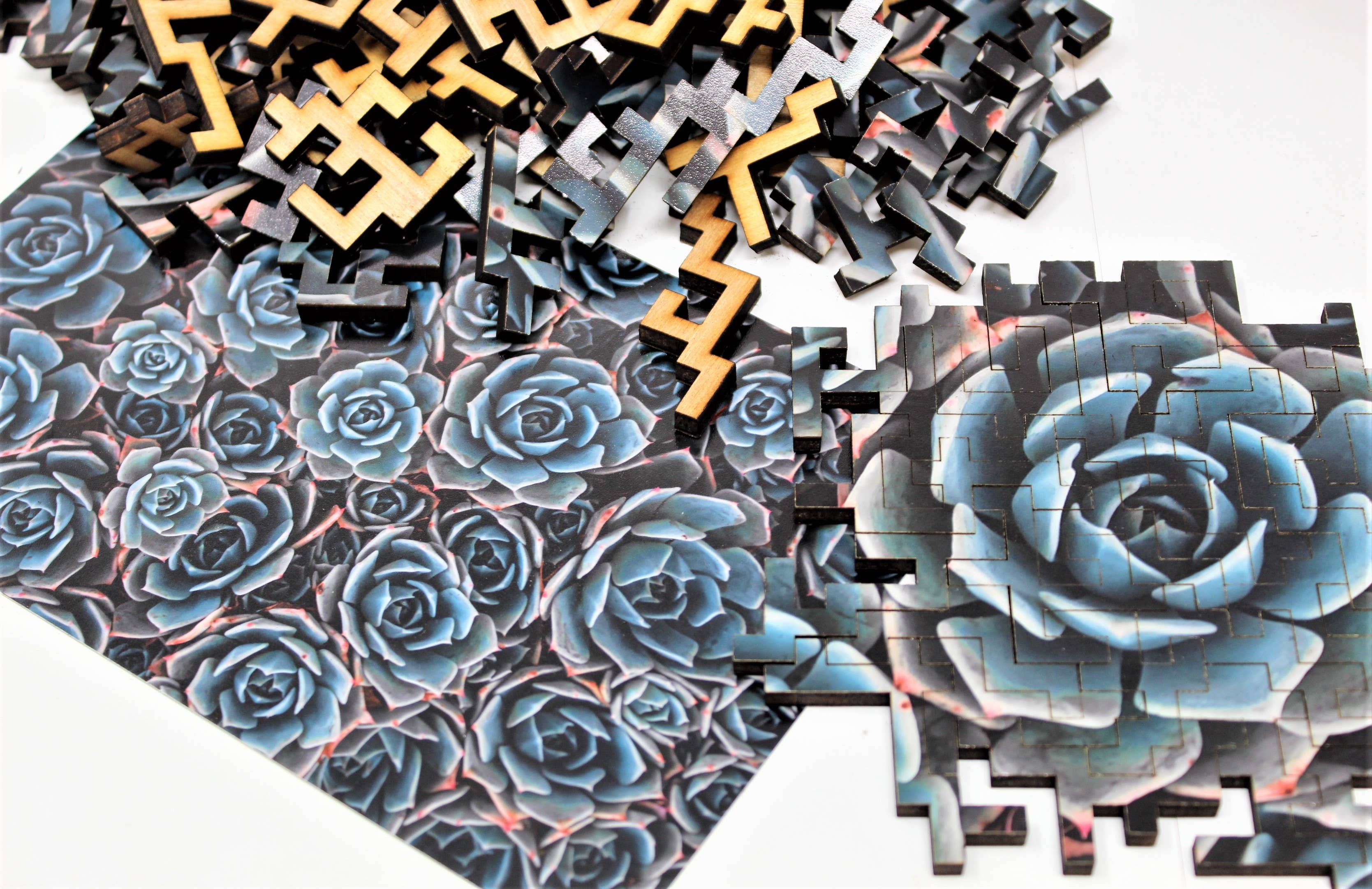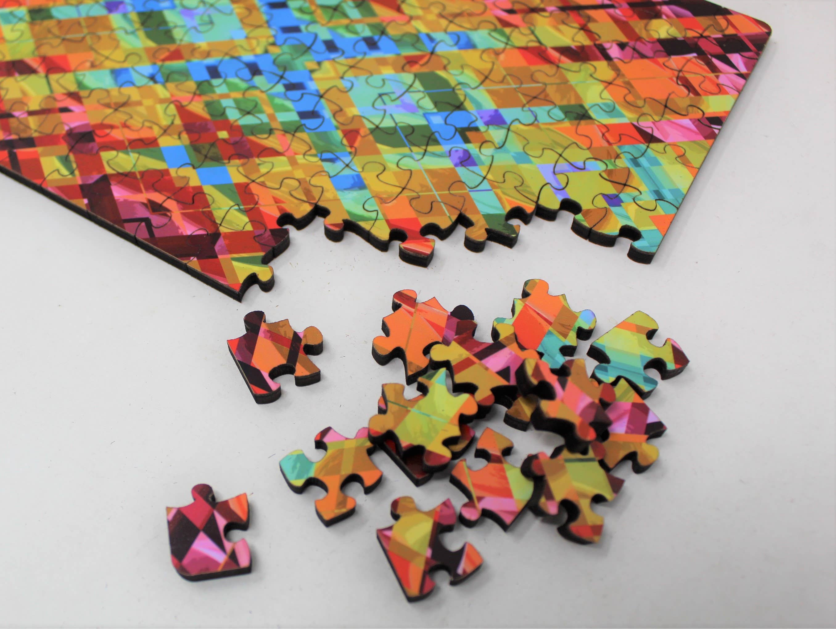 En livslång pusselare, Whitney började experimentera med att skapa sina egna pussel 2016. Trött på traditionella snittmönster, Whitney designade Bewilderness signatur ”geometrisk stil” som var så speciell, hon ville dela den med världen. Samarbete med lokala konstnärer för bilderna Förvirring lanserades 2017 och pusselvärlden förändrades för alltid. Sedan lanseringen fortsätter Bewilderness att skapa roliga och utmanande pussel med unika, huvudskrapande snittmönster. Vi fortsätter att göra signaturen geometrisk skärning i många storlekar och utökade nyligen vårt tessellationsurval, vilket fans älskar. Vi älskar också att arbeta med varumärken för att skapa anpassade pussel, slå oss upp! Vad gör en precisionslaserskuren trä pussel speciellt? -Passformen och känslan: Den taktila känslan av att hantera träbitar, det mjukt klamrande ljudet av att sålla genom bitarna i lådan och bitarnas snäva passform med varandra är en förtjusande sensorisk upplevelse. -Håll det fräscht: Oavsett kreativa och utmanande mönster vi kan drömma, kan vi skära i ett pussel. Laserteknik gör det möjligt för oss att kontinuerligt testa och förfina våra konstruktioner i farten. -Passa ner: Trä pussel är av hög kvalitet och är avsedda att hålla! Du och din familj kan göra dem om och om igen i många år framöver.