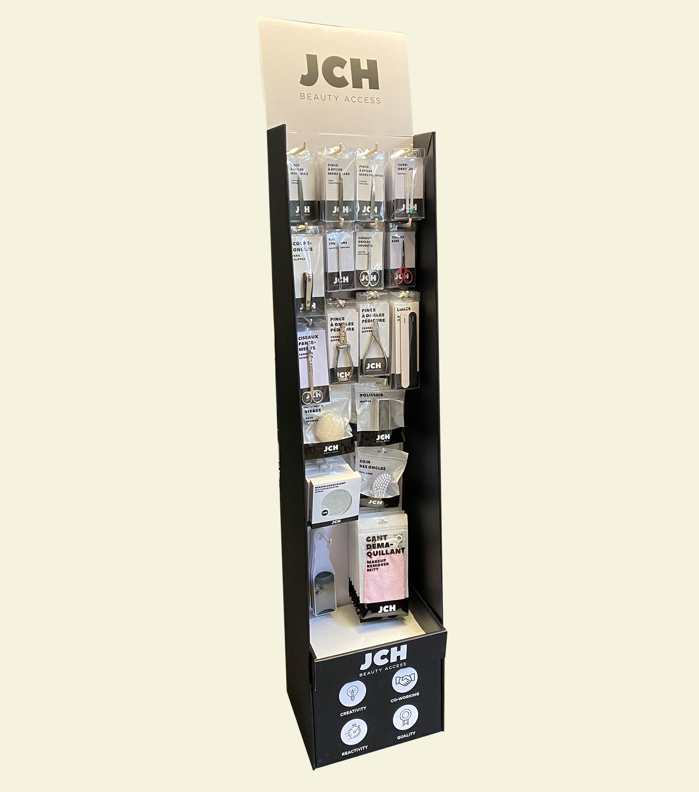 JCH BEAUTY ACCESS erbjuder ett komplett sortiment av skönhetstillbehör för allmänheten. Sortimentet erbjuder 100 sminkprodukter, manikyr, pedikyr, nagelvård och även produkter för män och Ergonomiskt spel. Kundservice, lyhördhet och styrka i förslaget är vår prioritet.
