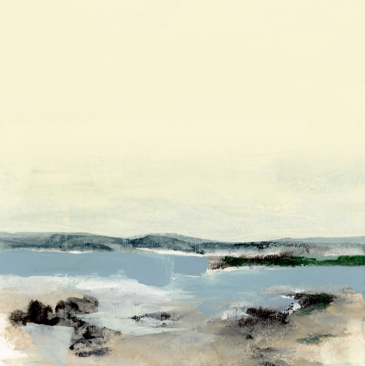 Som en fredssökande målare som bor på Johns Island, SC, har min resa tagit en okonventionell väg. Under min tid i konstskolan mötte jag motstånd för mina icke-traditionella metoder - kritik som ”du gör inte det rätt” och ”blanda inte det med det.” Detta ledde till att jag gick bort från måleri och omfamnade digital konst, där jag byggde en kreativ karriär för det kommande decenniet. Som Creative Director i digitala byråer finslipade jag min konstnärliga vision i det digitala rummet, men med tiden började jag längta efter något mer konkret, något fritt från skärmar. Den längtan drog mig tillbaka till målningen, inspirerad av en kärlek till naturen och sökandet efter inre frid. Jag experimenterade igen, men den här gången kände jag mig befriad från de traditionella reglerna. Under åren har jag vårdat denna hobby till ett litet företag, Mande Calhoun Art, LLC. Genom partnerskap med [Minted.com] (http://minted.com/), Juniper Print Shop och andra har mitt arbete presenterats på plattformar som Apartment Therapy, HGTV och Vogue. Min process är rå och intuitiv. Jag målar på handrivna pappersrester, blandar ofta material som pasteller, akvareller, akryl och till och med okonventionella element som sand och te. Min bakgrund inom digital konst ger mig möjligheten att skanna, skala, beskära och förvandla dessa fragment till större, effektfulla bitar. Jag skapar på golvet, vanligtvis med hög musik i bakgrunden, finner glädje i processen lika mycket som i resultatet.