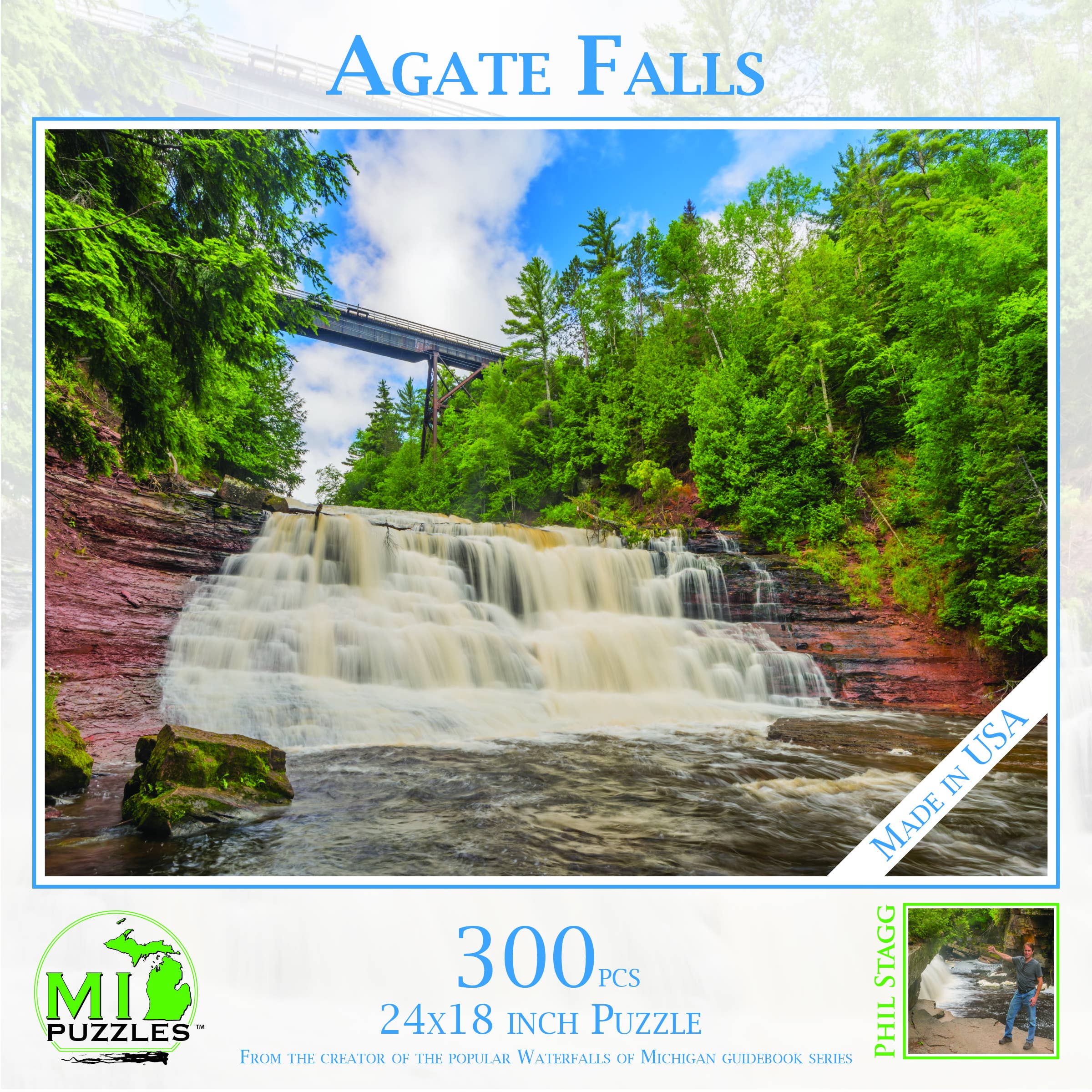 Hej! Jag heter Phil Stagg. År 2009 började jag fotografera Michigans vattenfall. Efter 9 år hade jag skrivit 5 guideböcker som ger massor av information om över 600 vattenfall i Michigan. Vi säljer tusentals av dessa böcker årligen. Efter att ha lagt till andra souvenirartiklar för våra butiker att sälja (vykort, nyckelringar, stift, dragkedjor, magneter etc.) Jag blev tillfrågad om pussel. Så 2018 började jag med 8 sticksågsdesigner. De tog verkligen fart! Nu har vi upp till cirka 300 mönster i lager med nästan 125 000 pussel i våra lager. Vad kommer du att hitta i vår pusselrad? Minnen. Jag lägger ut mönster som framkallar ett känslomässigt svar. Jag har haft så många kunder som berättar för mig att de var förlovade vid den här fyren, eller det vattenfallet. Att de alltid stannar vid den bron medan de är på semester. Att detta är deras favoritdjur. Jag säljer minnen. Saker som kunderna kan relatera till och glädjas åt. Jag inbjuder dig att gå med i över 500 andra butiker över hela landet som har våra MADE IN AMERICA-produkter. Du är alltid välkommen att kontakta mig personligen om du har några frågor. (231) 920-8416 Phil Stagg