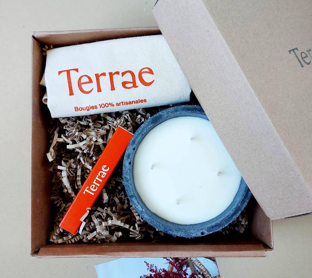 Terrae handlar först och främst om viljan att erbjuda ett hantverksmässigt och kvalitativt varumärke. Vi ville erbjuda en dekorativ produkt som skulle följa med oss i våra kvalitetsstunder samtidigt som den är ansvarsfull. Det var då varumärket föddes. Ljus gjorda av biologiskt nedbrytbar sojavax och icke-toxiska dofter. Tack vare dess betongbehållare, rå och designad, kan vårt ljus återanvändas som ett dekorativt element eller som ett evigt ljus tack vare våra vaxpåfyllningar.