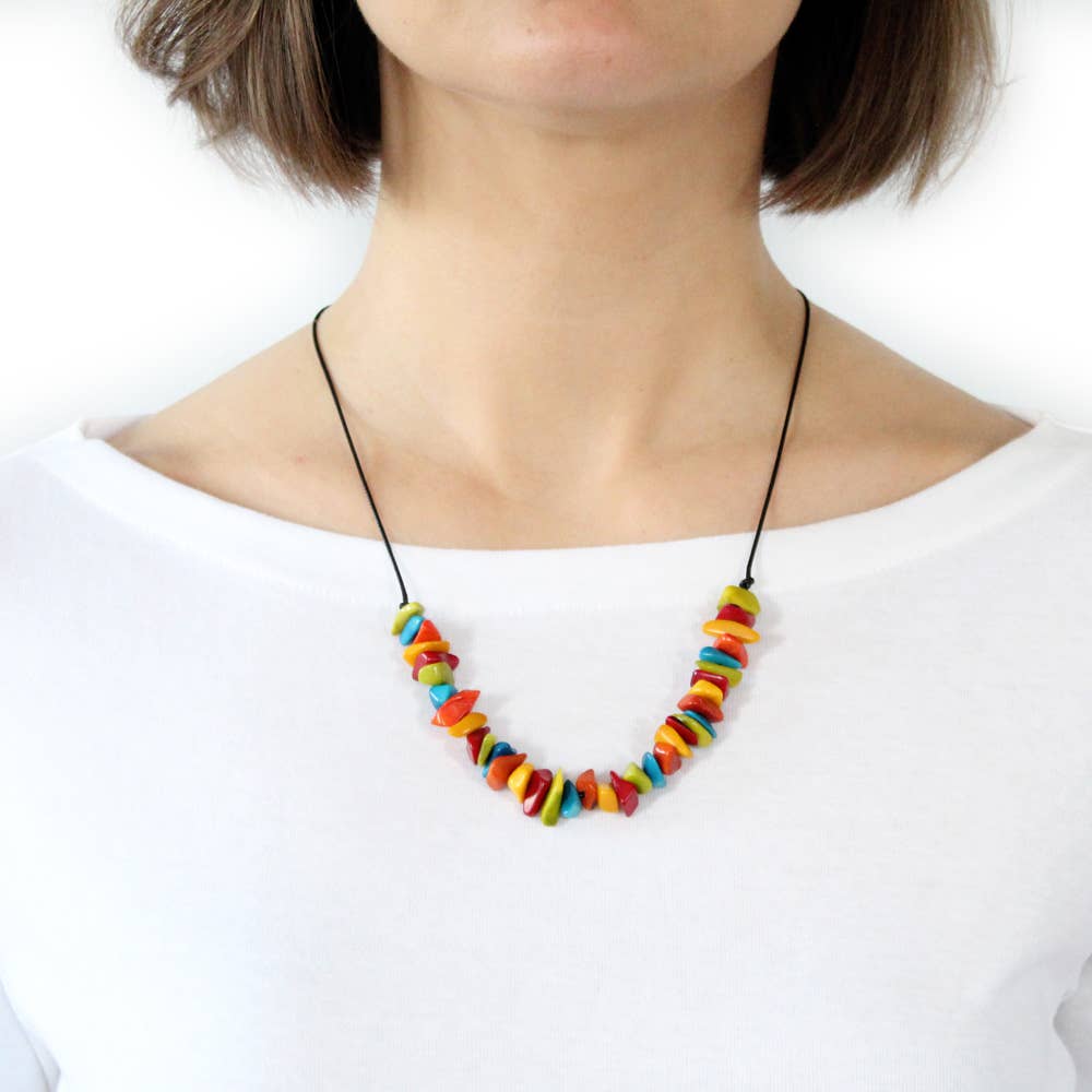 Muichic (moo.e.sheek) är Fair Trade, naturliga smycken designade i Vermont och etiskt handgjorda i Colombia. Med hjälp av Tagua-frön och andra naturliga råvaror tror vi på roligt, naturligt sätt och blandar elegant design med eko-medvetande. Unika tillbehör som är miljövänliga och elegant eleganta utgör vår naturliga kollektion. Vårt huvudsakliga råmaterial: Efter torkning blir Tagua-frön bergfast som liknar elfenben i färg, konsistens och hårdhet, därav deras smeknamn: ”Vegetabilisk elfenben”. Dessa torkade, hårda frön är polerade, skurna, färgade och formade till pärlor som blir Muichics naturliga smycken. Ekologisk och hållbar: Tagua är naturligt organiskt, det växer vilt i regnskogarna i Colombia. Tagua är hållbar, fröna skördas först när frukten är mogen och har fallit till marken, vilket gör det möjligt för Tagua-palmerna att ge djur värdefull livsmiljö och hjälper också till att bevara regnskogen genom att förhindra att träd för jordbruk eller boskap kapas.
