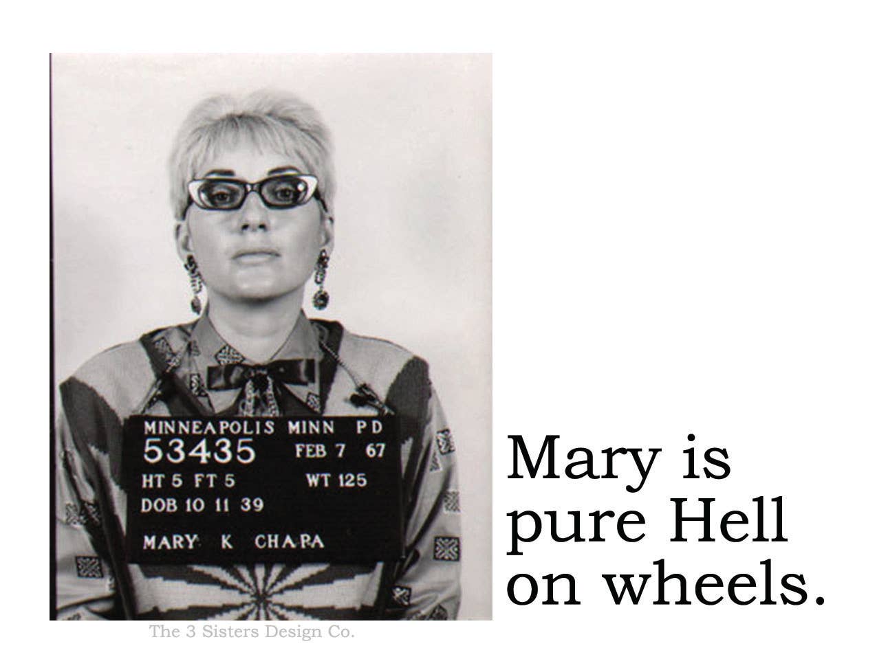 Snäsig, kaxig och lite tuff. Ja, det finns verkligen 3 systrar (logotyp skapad av farfar, Lapeer MI, cirka 1971). Storasyster Martha använder sin överaktiva fantasi för att skapa snäsiga saker. Vintage-stilens motellnyckelbrickor trycks internt med popkultur, tv-inspirationer och snäsiga och fräcka "företag". Efter att ha upptäckt ett lager av vintage-mugshots, lanserade Martha sin nya BIG HOUSE-linje med ljus, klistermärken, tvålar, lotioner, gratulationskort, klistermärken, tändstickor, vykort, örngott, kökshanddukar och luftfräschare! Vintage-mugshots kombineras med kaxiga kommentarer och presenteras alla på handgjorda, små produktionspartier tillverkade i USA.