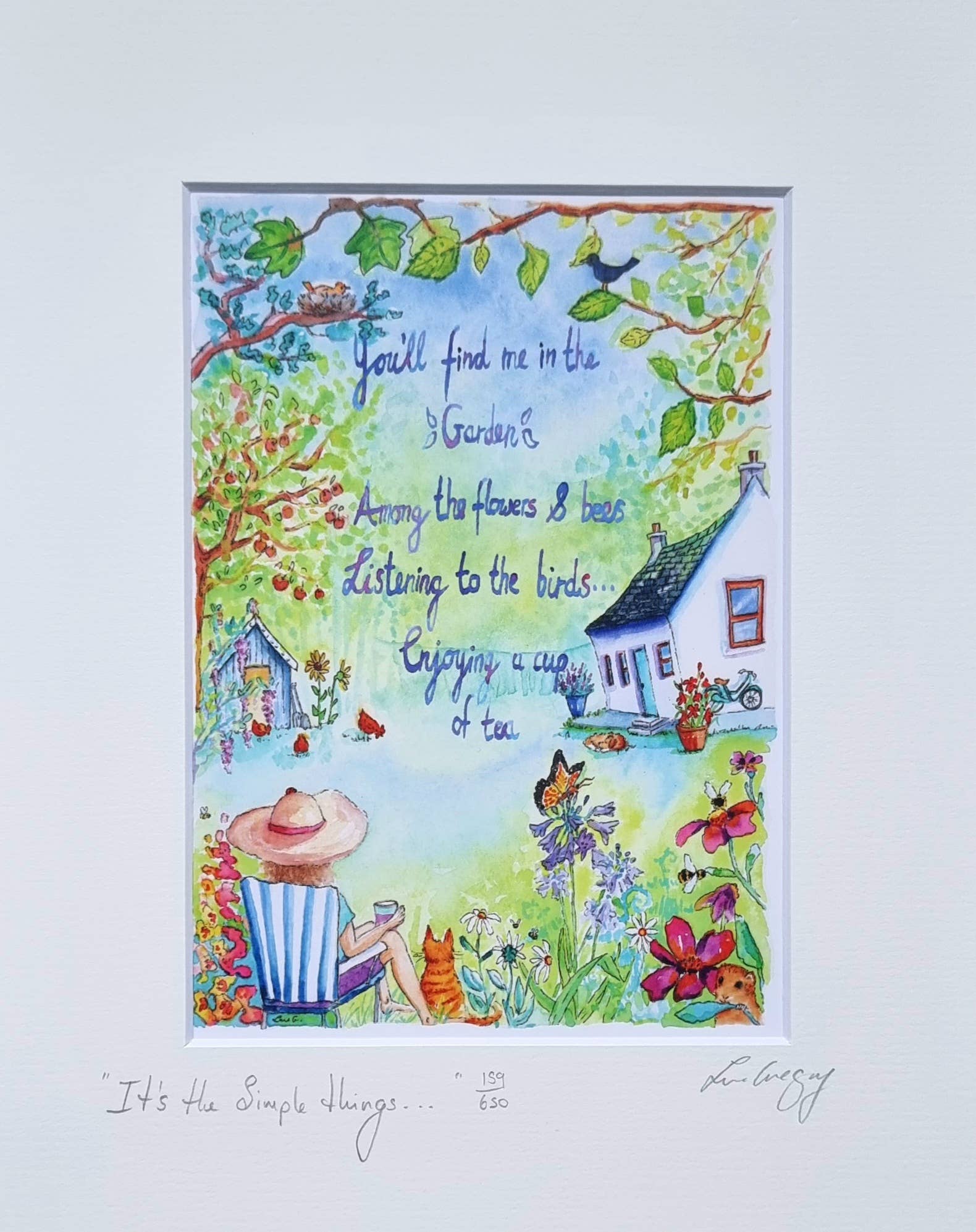 Jag är en akvarell- och akrylmålare. Min stil är rolig och illustrativ när jag använder akvareller, medan mina akrylmålningar är mer uttrycksfulla och måleriska. Mina tryck hänger i hem över hela världen. Mitt sortiment av tryck är underbara gåvor för många av livets firanden. De har sålt bra hos mina nuvarande 10 irländska återförsäljare under de senaste 8 åren. Min kärlek till teckning och målning började tidigt, båda mina föräldrar älskade att skissa och måla så det fanns alltid en pensel i närheten. Mina föräldrar flyttade till Irland i slutet av 70-talet och köpte en gammal stuga. Pengarna var mycket knappa men de lyckades skapa ett vackert hem. De älskade växter och träd och vår 1 hektar stora tomt var en oas av grönt och vackra blommor. Vi hade en komposttoalett i flera år, till många människors förfäran men jag gillade det. Jag minns när jag tog mitt första varma bad med rinnande vatten när jag var 9, spänningen. Mina målningar skildrar det gamla och nya i mitt liv. Jag började surfa i tidiga 20-årsåldern och älskar fortfarande den känslan av att ta en våg, nu i 40-årsåldern, det är en elektrisk känsla. Målning är en absolut glädje för mig, jag förlorar mig i varje verk, hittar på historier om vad som händer. Jag hoppas verkligen att du kan känna värmen och mysigheten i mina målningar. Ps... trycken är mycket finare i verkligheten än vad bilderna visar 😁