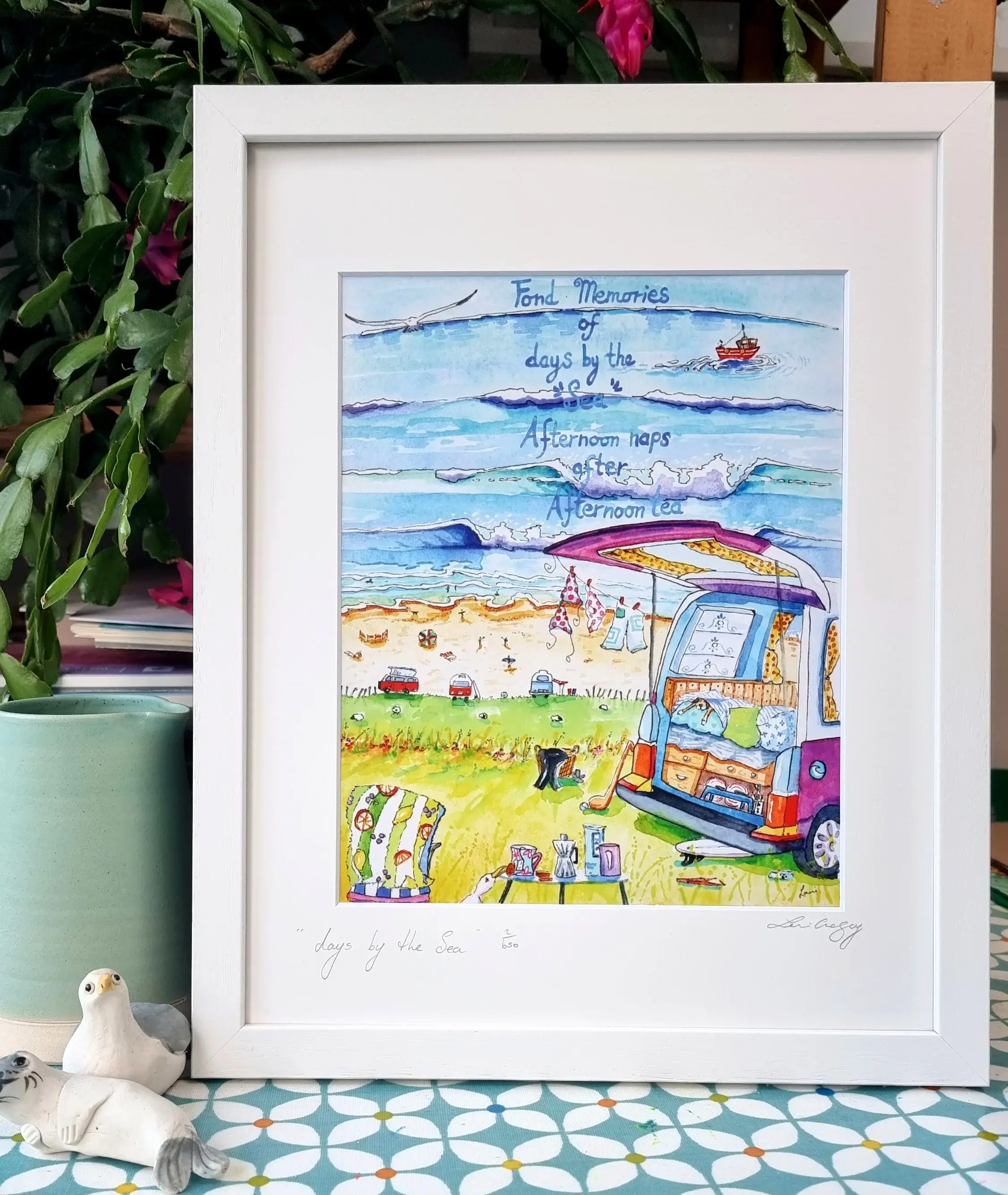 Jag är en akvarell- och akrylmålare. Min stil är rolig och illustrativ när jag använder akvareller, medan mina akrylmålningar är mer uttrycksfulla och måleriska. Mina tryck hänger i hem över hela världen. Mitt sortiment av tryck är underbara gåvor för många av livets firanden. De har sålt bra hos mina nuvarande 10 irländska återförsäljare under de senaste 8 åren. Min kärlek till teckning och målning började tidigt, båda mina föräldrar älskade att skissa och måla så det fanns alltid en pensel i närheten. Mina föräldrar flyttade till Irland i slutet av 70-talet och köpte en gammal stuga. Pengarna var mycket knappa men de lyckades skapa ett vackert hem. De älskade växter och träd och vår 1 hektar stora tomt var en oas av grönt och vackra blommor. Vi hade en komposttoalett i flera år, till många människors förfäran men jag gillade det. Jag minns när jag tog mitt första varma bad med rinnande vatten när jag var 9, spänningen. Mina målningar skildrar det gamla och nya i mitt liv. Jag började surfa i tidiga 20-årsåldern och älskar fortfarande den känslan av att ta en våg, nu i 40-årsåldern, det är en elektrisk känsla. Målning är en absolut glädje för mig, jag förlorar mig i varje verk, hittar på historier om vad som händer. Jag hoppas verkligen att du kan känna värmen och mysigheten i mina målningar. Ps... trycken är mycket finare i verkligheten än vad bilderna visar 😁