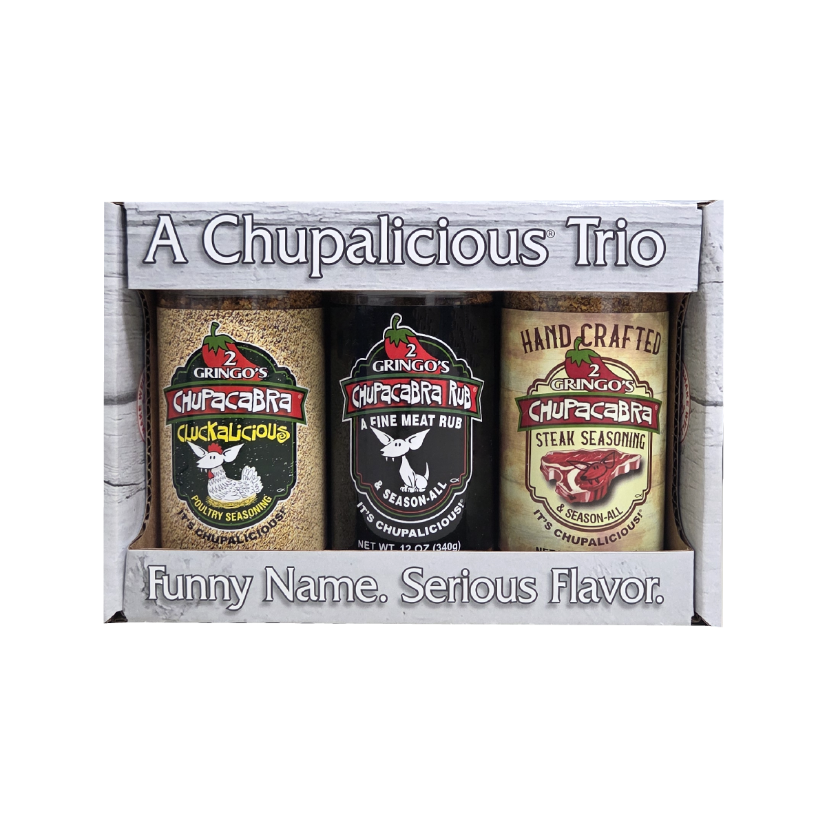 Vi är 2 Gringos och vi gör den finaste gnidningen, salsa, pommes frites, ryckig, och marinad du någonsin har smakat. Om faktum, Vi har fått höra av ett gäng av de bästa Grill Masters att vår gnugga är den de använder när de tävlar om utmärkelser. Heck, de säger att det är så jättebra att det till och med skulle få en död Chupacabra att smaka bra! Det var så vi blev kända som 2 Gringos Chupacabra och det är ”Chupy,” Vår Chupacabra-maskot där på etiketten. Så vad är det en Chupacabra? Väl, det är en ornery liten mytisk varelse som de säger vandrar runt Karibien, Sydamerika, genom Mexiko och upp i delar av Texas. Det jagar i princip runt nötkreatur och sådant. Legenden har överlämnats i generationer. Alla pratar om dem, men ingen har någonsin fångat en. Men kom ihåg detta - du kan använda vår gnugga på kött, kyckling, vilt, fisk, grönsaker - eller till och med popcorn - och det blir jättebra! Det viktigaste du behöver veta om 2 Gringos Chupacabra produkter är att vi är så bra eftersom vi bara använder de finaste ingredienserna och aldrig, någonsin ta genvägar när det gäller kvalitet. Vi föddes i Texas och våra produkter tillverkas i Texas, men vi är älskade av alla! ”Säsongen alla” som kommer att göra vad du serverar verkligen Chupalicious! - Gringo