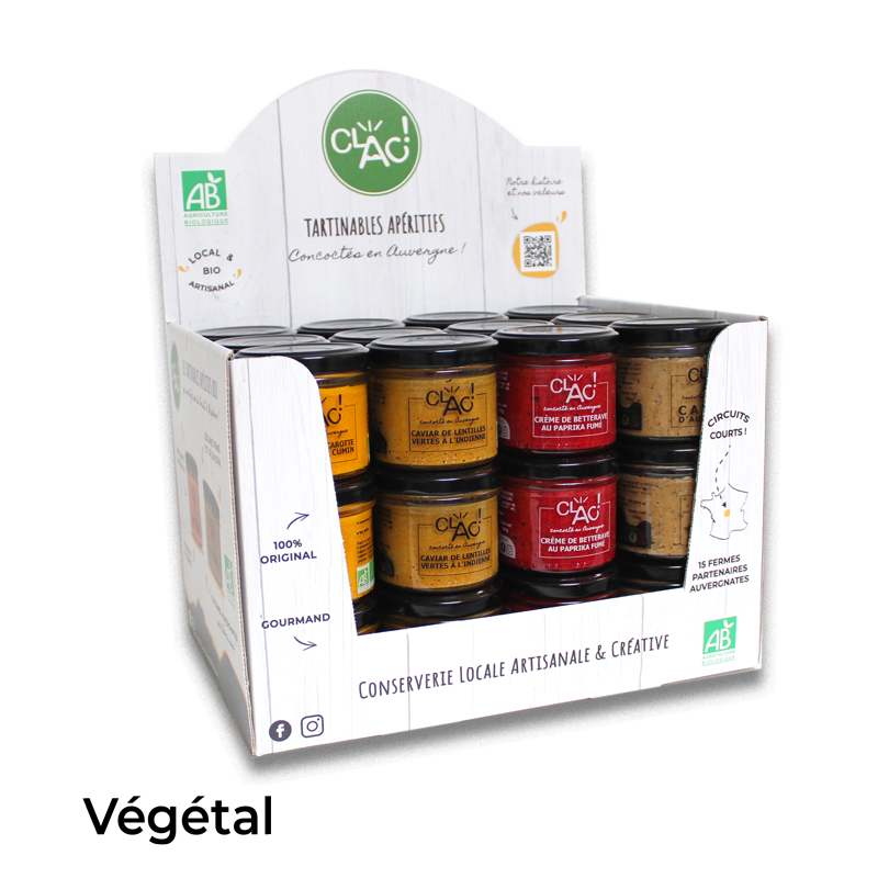 Sedan juli 2017 har CLAC, Local Artisanal och Creative Cannery inbillat sig och lagat ekologiska konserver från lokala råvaror från femton gårdar och partnergårdar i Auvergne. I enlighet med våra 3 pelare, BIO, LOCAL och HANDICRAFT, arbetar vi med färska ingredienser, skördade på full mognad för att erbjuda dig läckra och 100% ursprungliga recept. Våra produkter säljs exklusivt i ekologiska butiker och delikatesser. Vi inbjuder dig att titta på vår presentationsvideo för att ta reda på mer: https://www.youtube.com/watch?v=SIz_EZU2bDo Vi deltar i en bättre värld genom att spara ”fula” grönsaker och överskottsproduktion. Denna kamp mot matavfall bidrar också till att förbättra inkomsterna för våra partner ekologiska producenter.