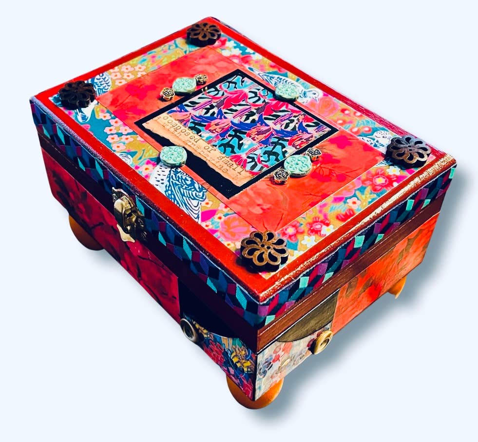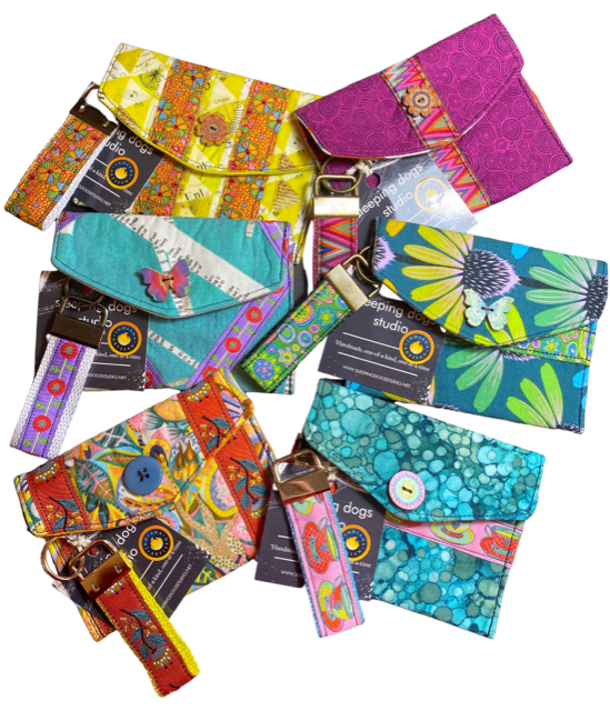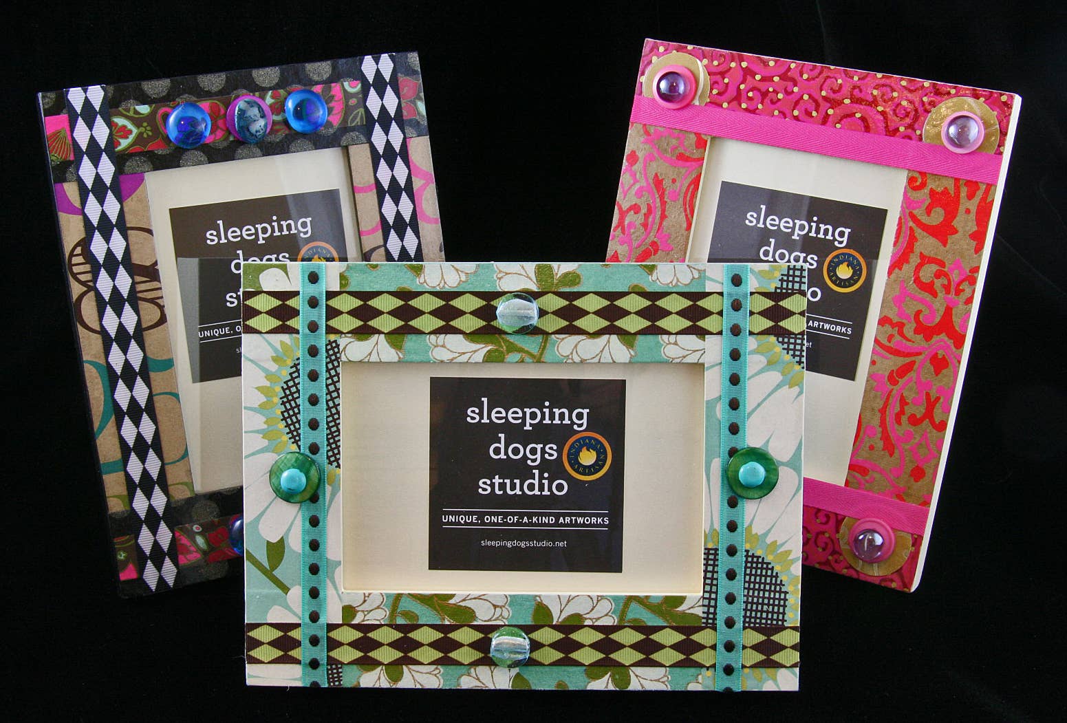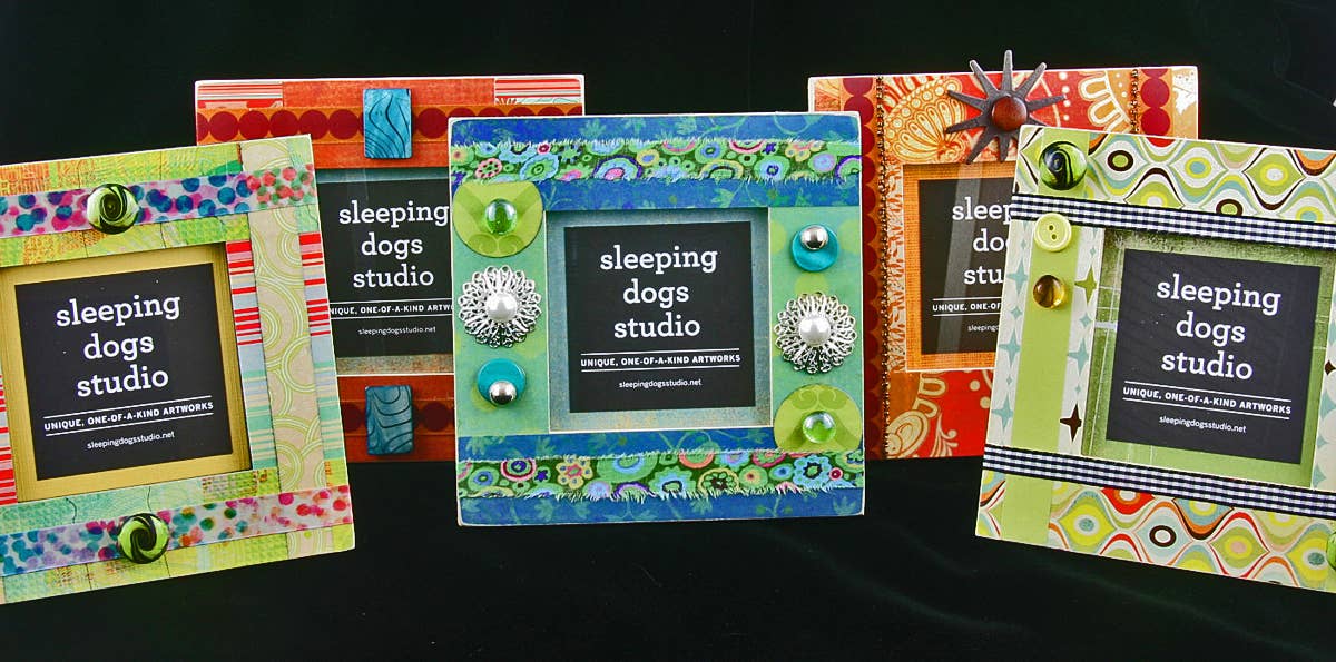 De handgjorda föremålen gjorda av Don och Carolyn Madvig på Sleeping Dogs Studio i Bloomington, IN har varit ett unikt alternativ för unika konstverk i hela USA sedan 1995. Vi är stolta över det faktum att alla våra konstföremål görs genom en process som innebär att man tittar igenom hundratals bitar av papper och tyg; tillsammans med ett enormt utbud av utsmyckningar från år av insamling. Vår skattgruva innehåller fibrer, hittade föremål, handgjort papper, återvunna frimärken och vintagefotografier, bara för att nämna några. Vår övergripande filosofi har alltid varit att återvinna och lyfta vardagliga föremål till vackra konstverk som är: 1) rimligt prissatta, 2) vackra att titta på och 3) funktionella för varje dag. Dessutom stöder vi vår namne ”bästa vänner” genom att se till att en del av våra vinster alltid går till hundräddning i hela USA. Vi var särskilt hedrade över att ha hamnat i Indiana Artisan-programmet som erkänner det bästa i Hoosiers hantverk 2004.