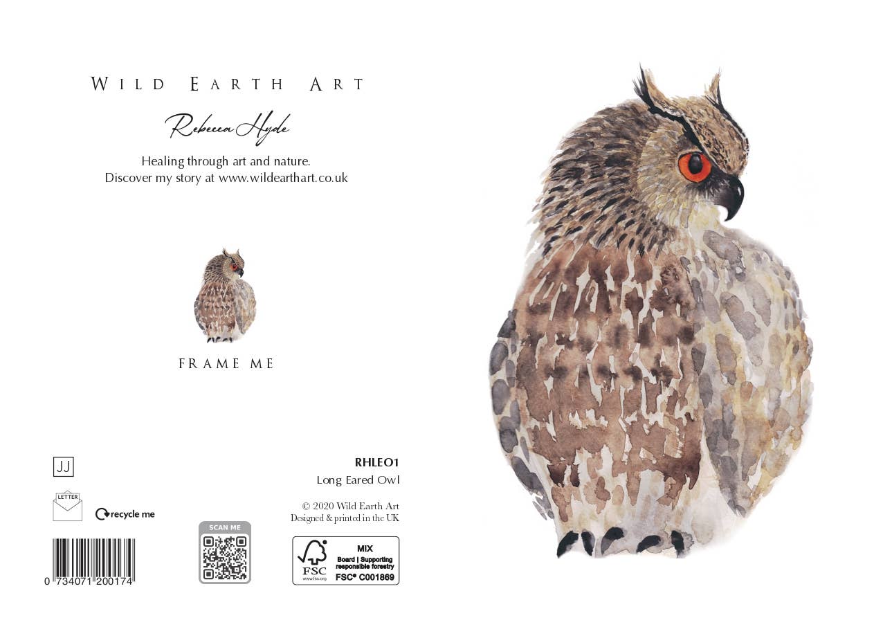 Jag heter Rebecca Hyde, jag är en ny konstnär med en passion för naturen. Speciellt fåglar (ugglor) och fjädrar! Jag är ensamstående mamma till en underbar tonårspojke och tre katter. Vi bor i Oxfordshire. Jag är fortfarande väldigt ny på ny akvarellmålning, penseln blev helande för mig, efter en lång 2-årig återhämtning från en dålig olycka och flera operationer på min högra arm, handled och axel. Det har varit gåvan från en svår tid, när min arm inte var bra för mycket annat. För det är jag så tacksam. FSC-certifierat kort/papper - Papper och andra tryckunderlag gjorda av träd är både förnybara och återvinningsbara, när de är ansvarsfullt anskaffade och känsligt bearbetade - därför använder jag bara FSC-certifierat lager. 100% återvunna kuvert För att minska vägmil skickar jag direkt från mina skrivare. Mönster som innehåller folierade områden är helt återvinningsbara.