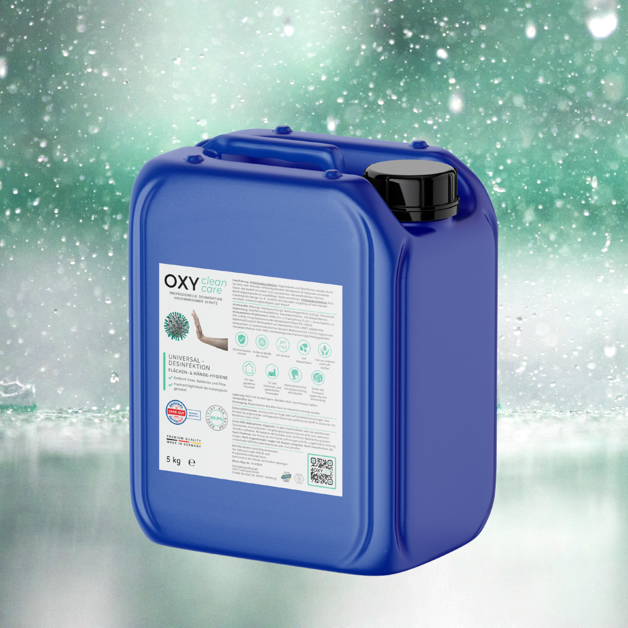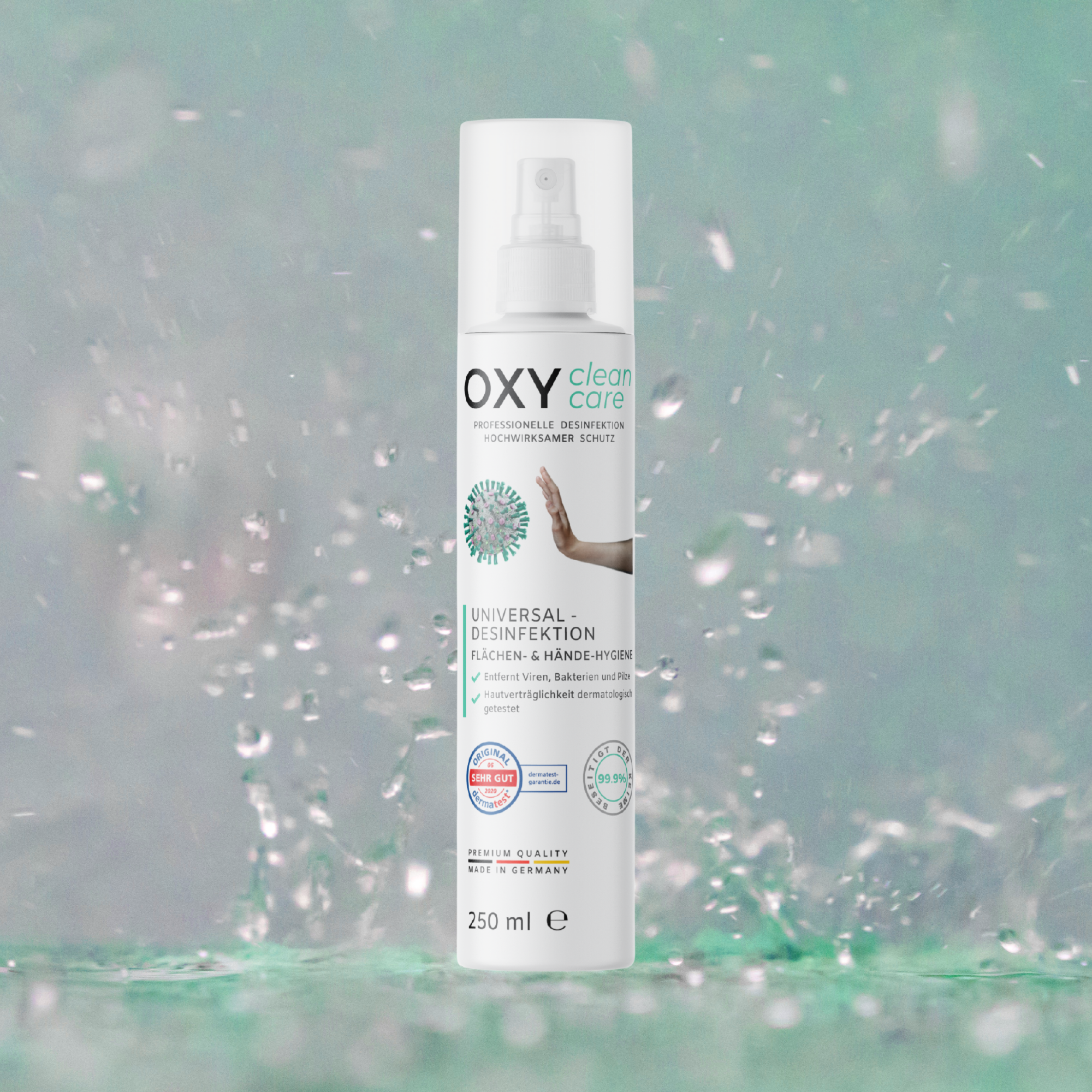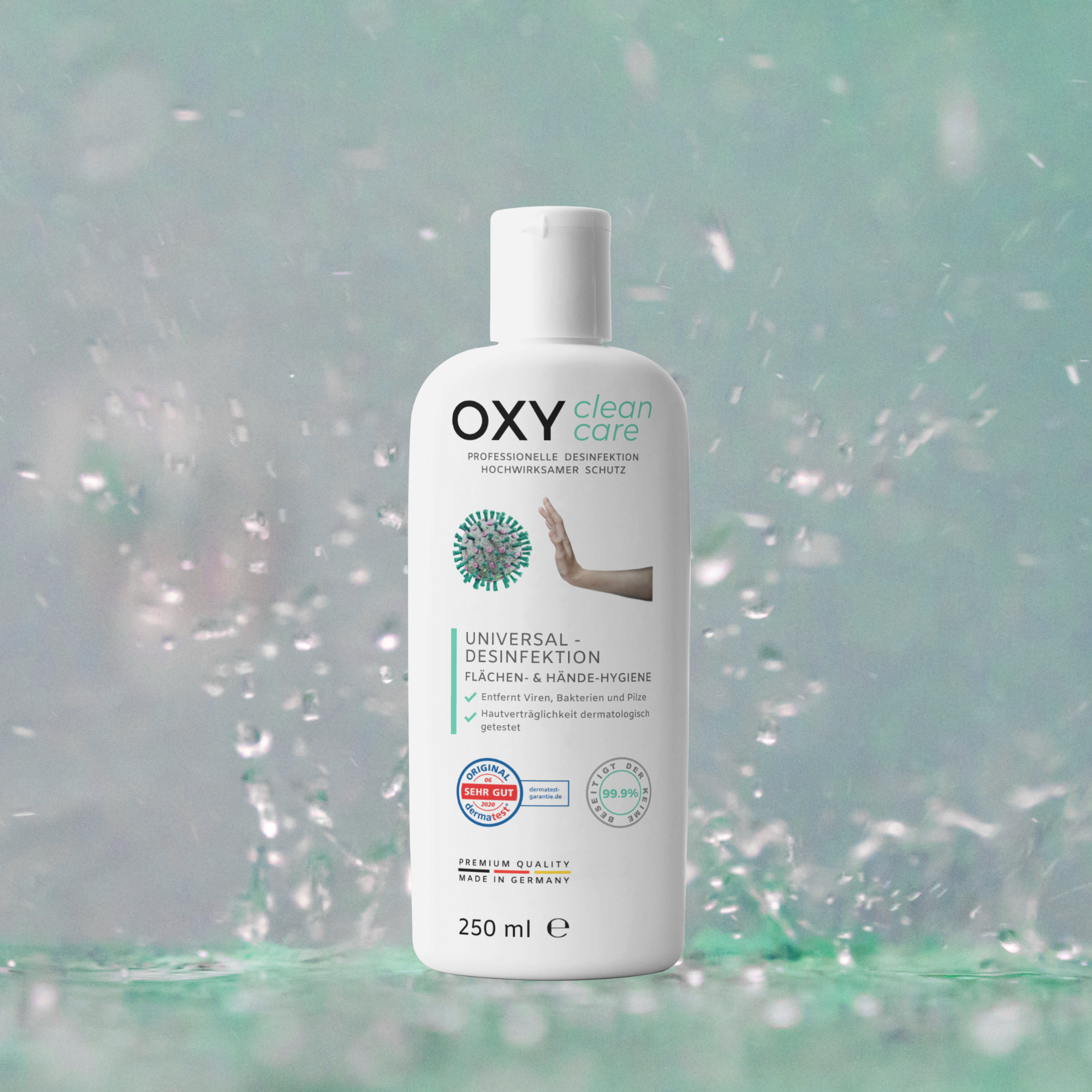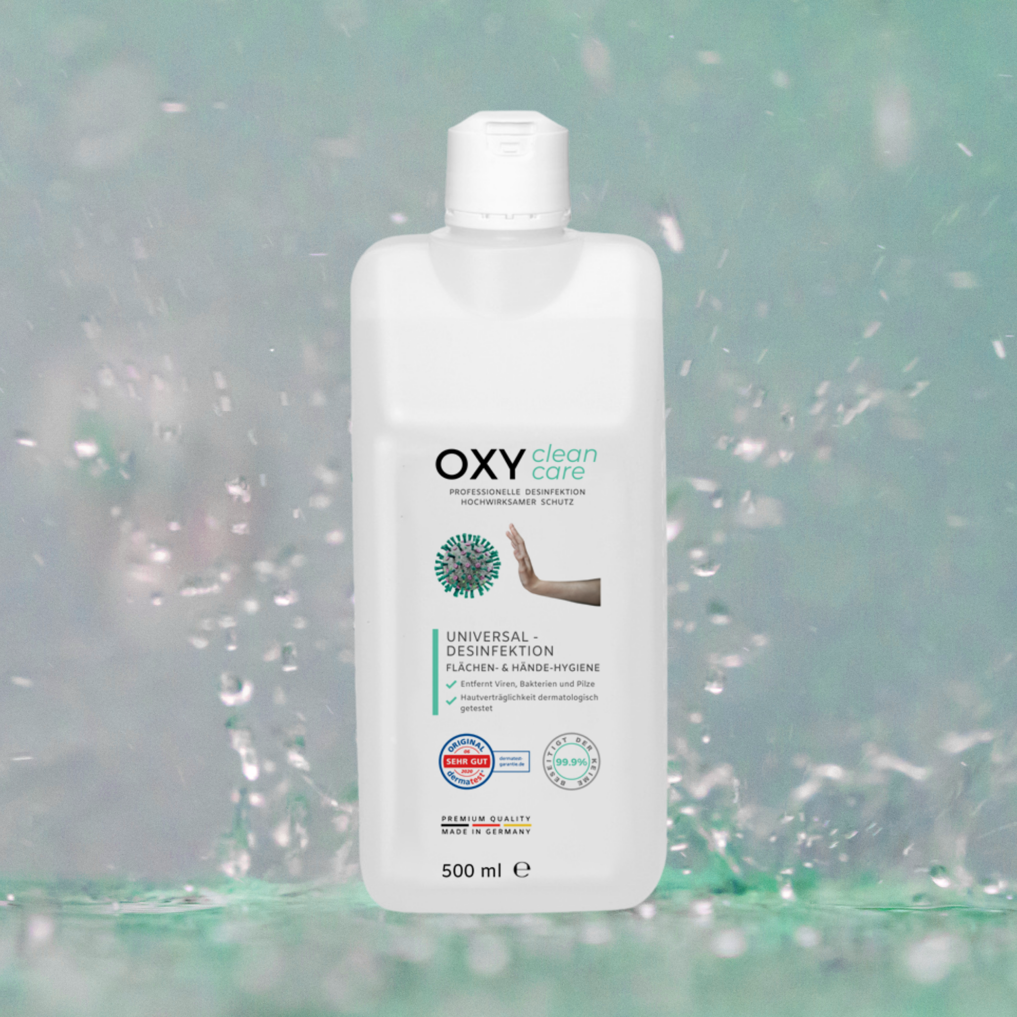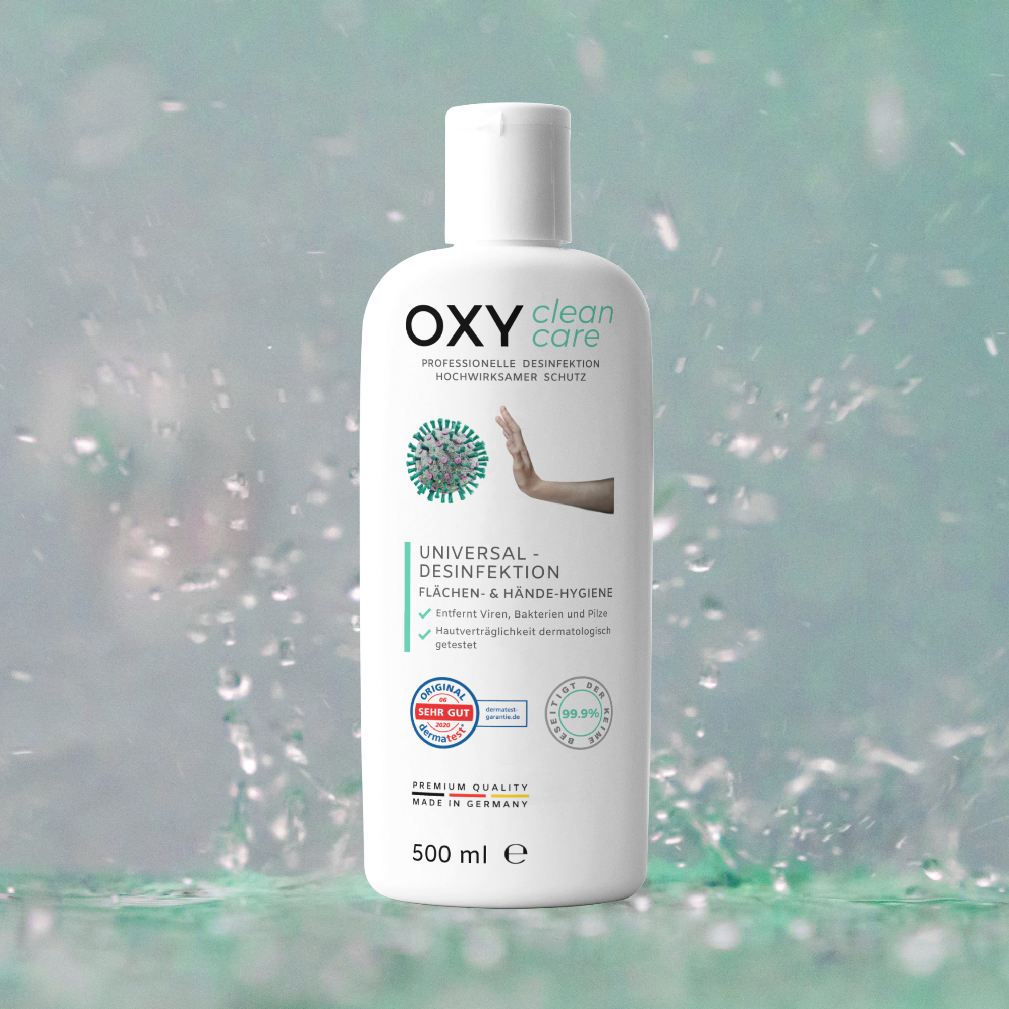 OXY CleanCare är utvecklad och tillverkad i Tyskland och är en ny typ av desinfektionsmedel som har utvecklats för att göra det lättare att använda och utöka tillämpningsområdet. Resultatet är en helt ny universell formel och en premiumprodukt som tillverkas under de strängaste förhållandena och eliminerar effektivt de vanliga underskotten hos befintliga produkter