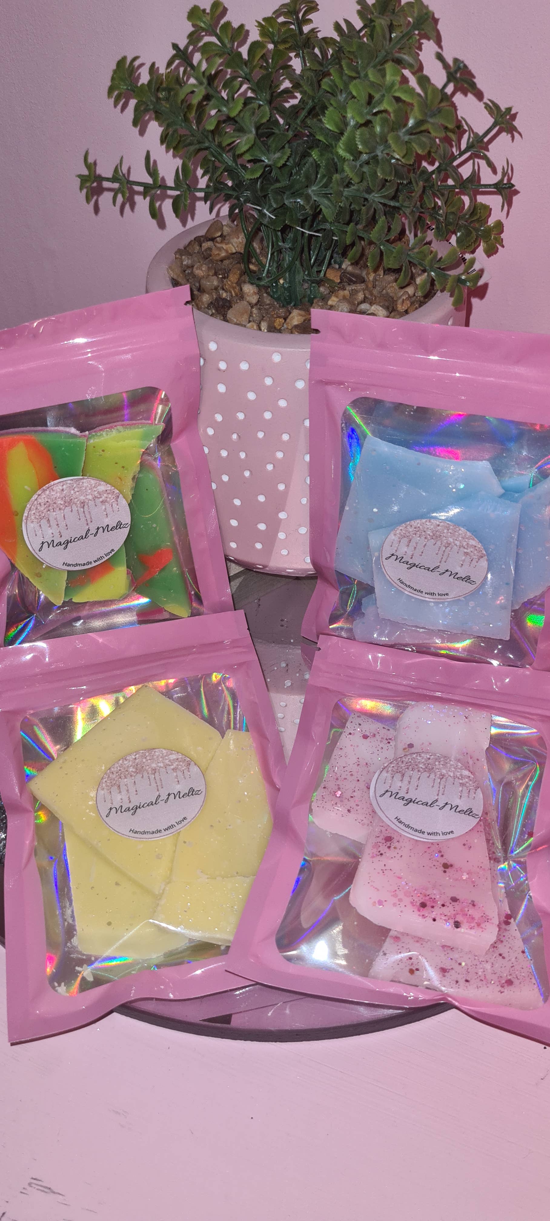 Mitt varumärke började låsas ner när min man blev obotligt sjuk. Mina barn hjälpte mig att ta hand om honom medan jag stannade kvar på jobbet, men tyvärr gav jag upp arbetet för att låta mina barn leva sina egna liv och gå ner sina egna karriärval och blev mina män heltidshjälpare. Jag kände mig då halka in i depression och ångest och bestämde mig för att ta upp en hobby som var vaxsmältning gör för 12 månader sedan vilket har lett till var jag är nu. Jag är mycket stolt över mina smälter direkt från förpackningen, färgen, doften som används och stor uppmärksamhet på detaljer. Jag hoppas att du har en stor erfarenhet av shopping i min grossistbutik. Magical-Meltz Team