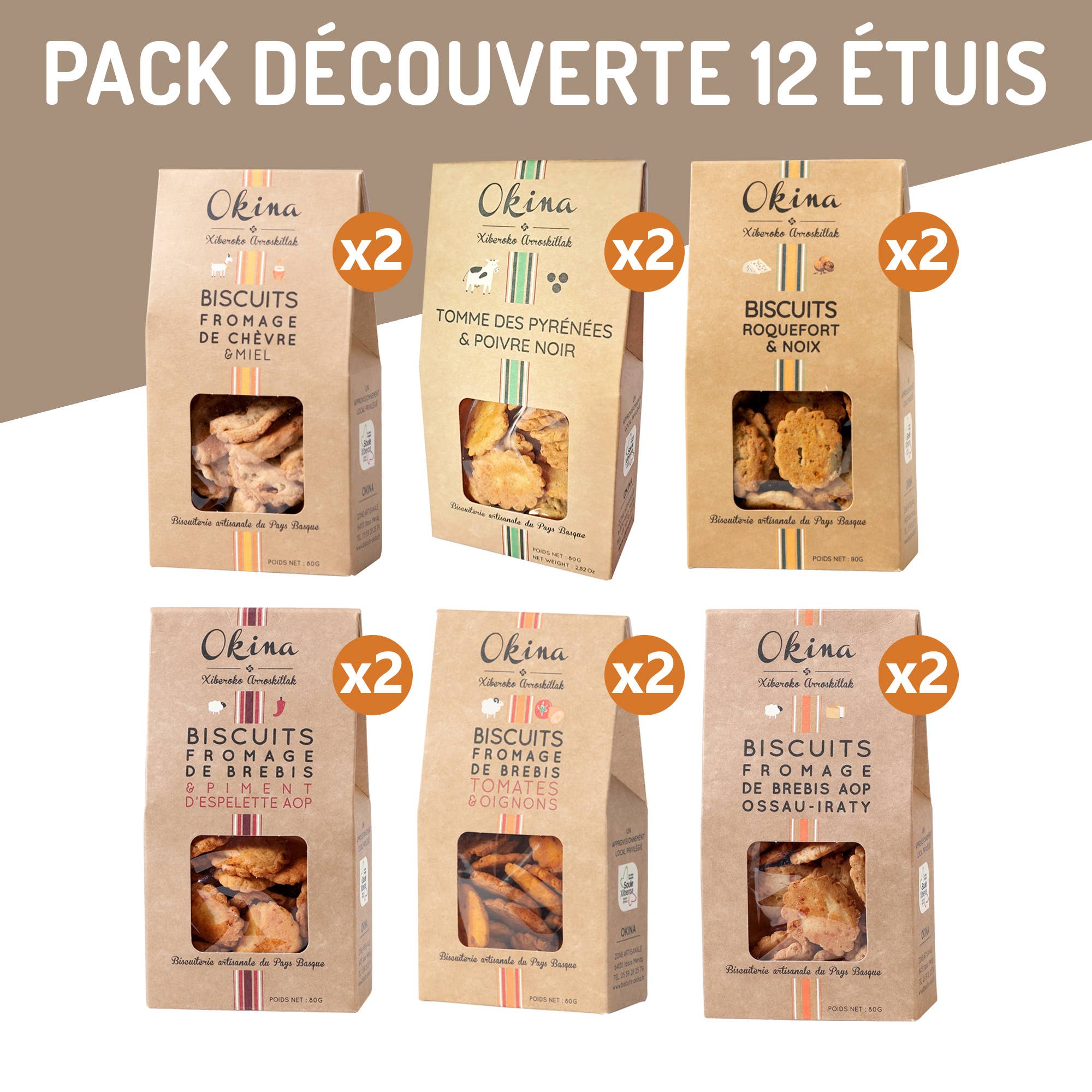 Beläget i hjärtat av Baskien, och med 10 års erfarenhet, är Okina en hantverksmässig kexfabrik som erbjuder produkter med enkla och naturliga recept. Charmen i dess kakor fungerar tack vare en behagligt krispig konsistens. Valet av råvaror görs med kvalitets- och lokala producenter: Ossau Iraty SUB fårost tillverkas några kilometer från kexfabriken, mjölet kommer från en lokal mjölkvarn och chili kommer uppenbarligen från Espelette. Okina-kakor innehåller inte konserveringsmedel, färgämnen eller palmolja. En säker förälskelse på salta kex som en aperitif, dessa kreativa ostbaserade recept är lätta, känsliga... helt enkelt oemotståndliga!