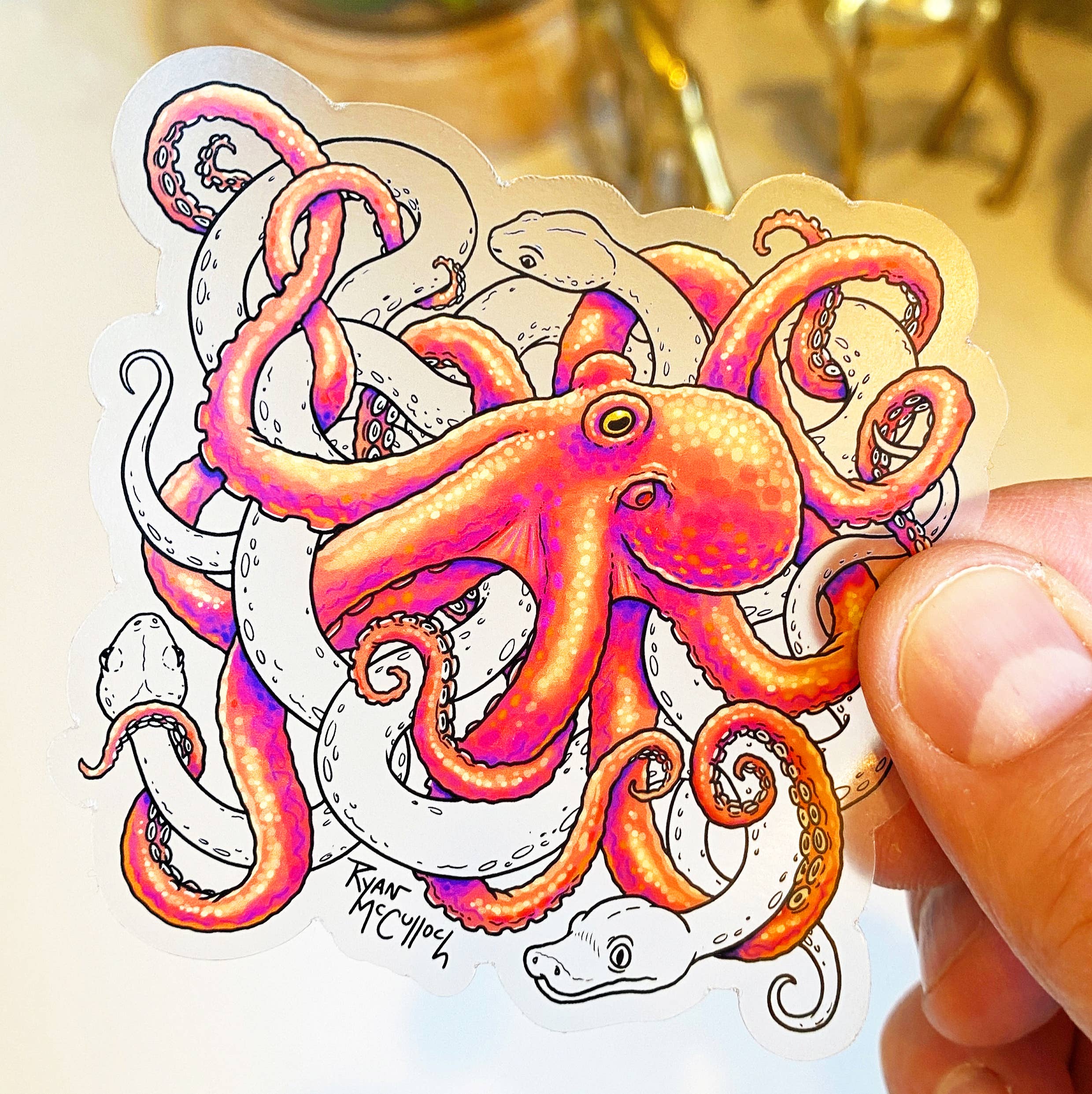 Min butik fokuserar på premium vattentäta klistermärken, som lyfter fram specialmaterial som holografiskt, transparent, glitter, glöd-i-mörker, 3-D och mer! Dessa vinylklistermärken är extremt hållbara och UV-skyddade också! Mitt konstverk kretsar främst kring min kärlek till djur... och vanligtvis min besatthet av mat också! Det gör mig så glad att ha mina klistermärken i så många butiker runt om i landet. Och det faktum att dessa butiker kommer tillbaka för att fylla på lager flera gånger om året, gör mig verkligen stolt! TESTIMONIAL: ”Våra kunder älskar Ryans klistermärken, de flyger från hyllan! En återspegling av hans fantasi och kreativitet, hans mönster är geniala. Det är fantastiskt att se människor lysa upp när de tittar på dem.” -Evigt utvecklande exotik, Tucson AZ