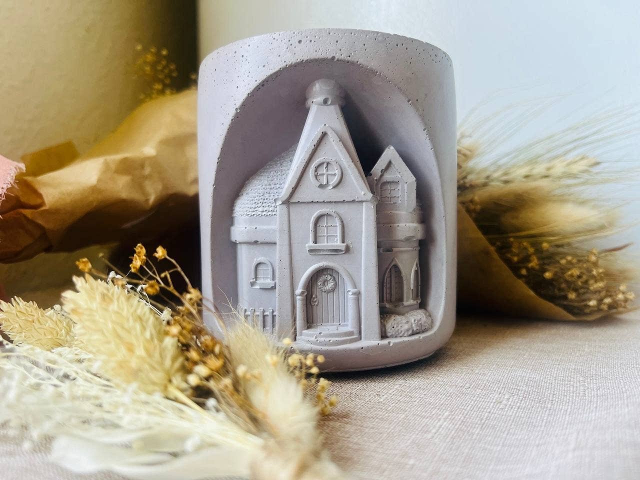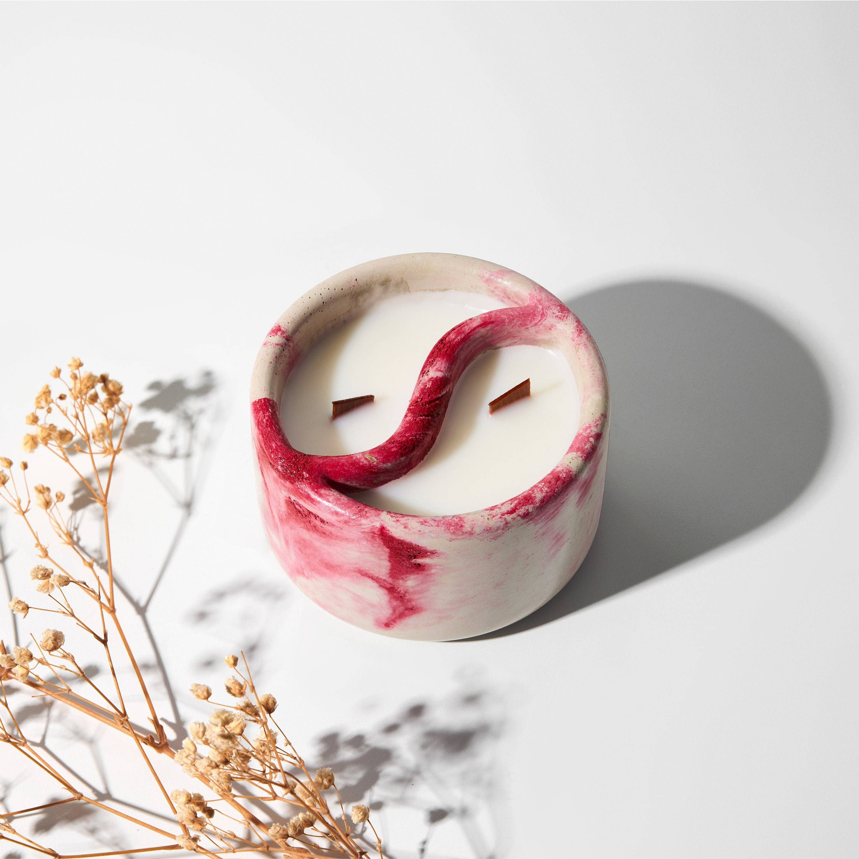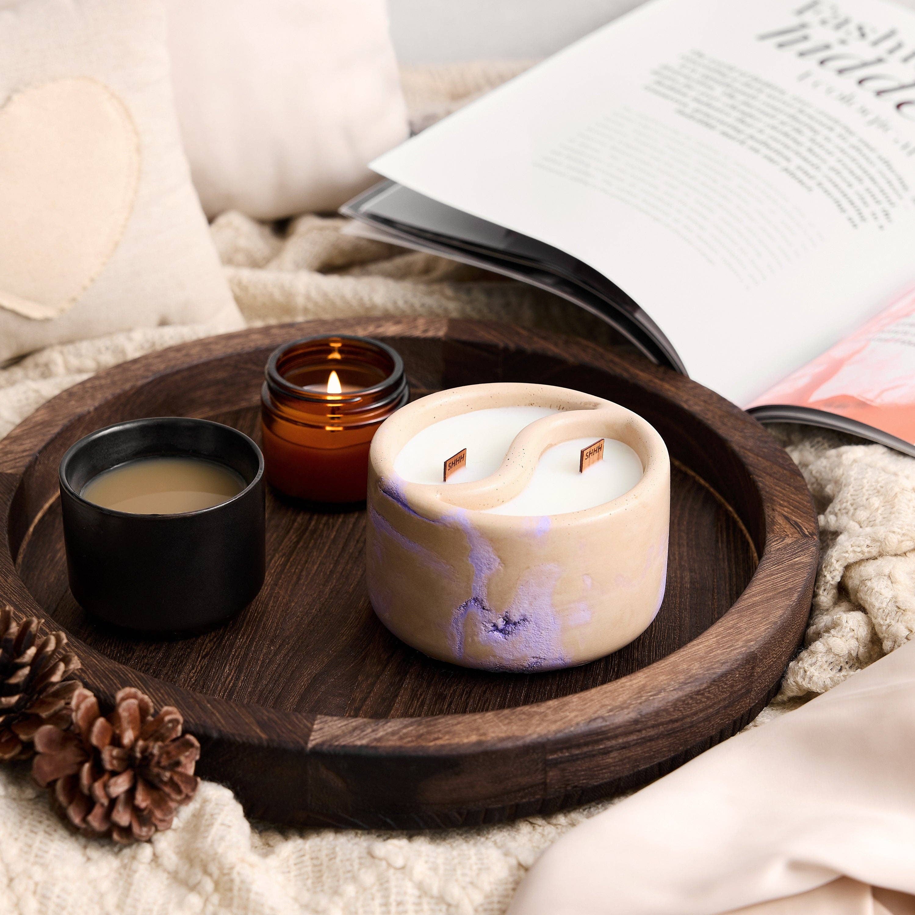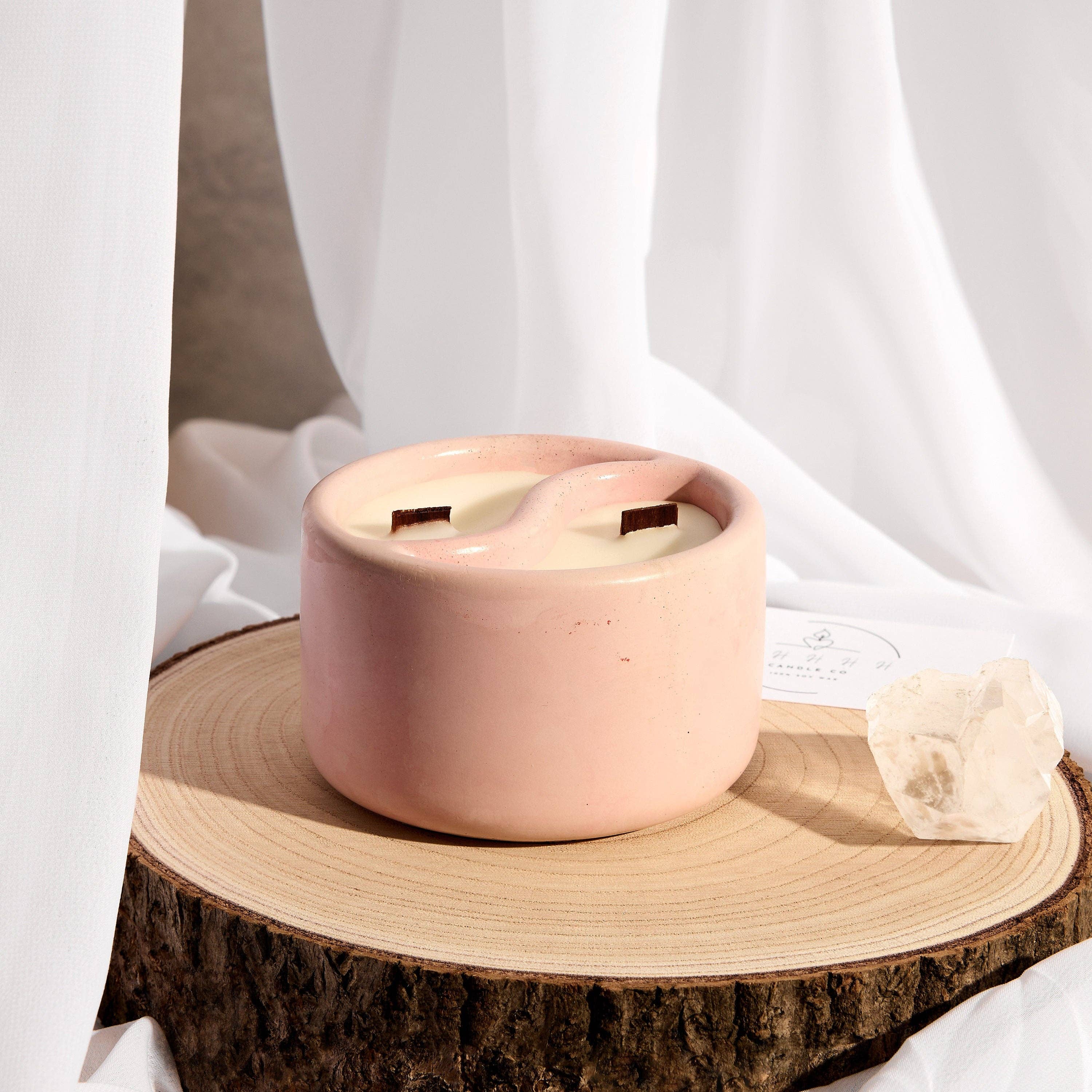 Idén bakom mina ljus kommer från en filosofisk utforskning av dualitet. Ungefär som våra stadslandskap, dominerade av grå betongkonstruktioner, hittar vi också naturens känsliga skönhet: grönskande kullar, blommande blommor och frodiga buskar. Dessa kontrasterande element samexisterar harmoniskt och speglar sammansmältningen av betongens motståndskraft med vaxets bräcklighet. Det inspirerade mig att slå samman det vanliga med det känsliga och vackra. Jag använder också trävekar som vi mest kan höra i tystnad och det är vad jag skapar mina ljus för - för att du ska njuta av tystnaden efter en lång dag med arbete eller ärenden. Så här föddes Shhhh Candles av Kat.