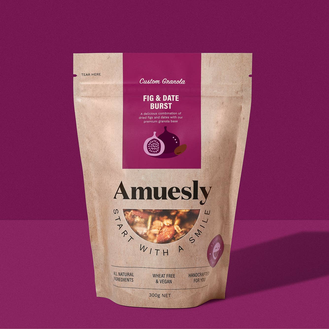 På Amuesly, vi tror att alla bör börja dagen med ett leende och att friska kan vara välsmakande också. Därför har vi skapat vårt läckra sortiment av müsli och granola. Vår historia började som tre vänner som band över vår kärlek till vackra saker, bra mat och goda tider. Som upptagna mammor, vi var alltid på jakt efter en bekväm, hälsosam frukost som smakade bra. Så vi kokade upp tanken på Amuesly - att tro att alla förtjänar ett bättre, roligare sätt att börja dagen.