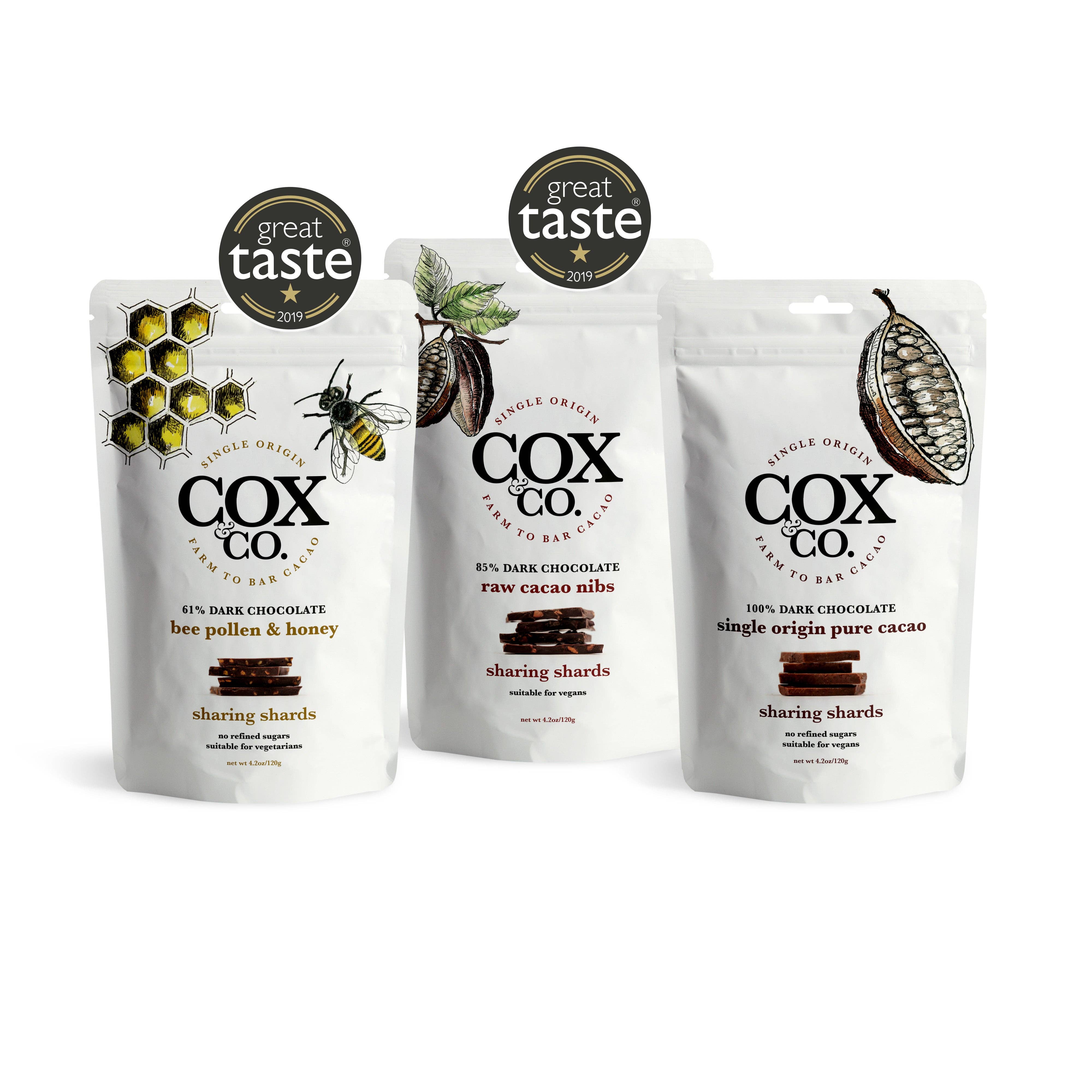 Vår grundare, Gavin Cox, tillbringade mycket av sina yngre år på samma plats där all vår kakao kärleksfullt odlas - Sydamerika. Så när han utvecklade Cox&Co. visste han att för att skapa den bästa smakande chokladen, var han tvungen att använda vad han anser är den bästa kakaon i världen, och den måste produceras så etiskt som möjligt. Genom att arbeta med affärspartners för att utveckla inte bara de bästa smakkompositionerna, utan också hur man gör detta till en chokladkaka att må bra av, bestämde sig Gavin för att samarbeta med Luker Chocolate, en egendom i Colombia. Luker Chocolate investerar i sina bönder, samhällen och har utvecklat miljömässigt hållbara jordbruksmetoder, vilket innebär att Cox&Co. kunde garantera att all deras kakao var fullt spårbar, fri från slavarbete och smakade otroligt. Från början till slut har Cox&Co fokuserat på att producera choklad som inte får människor att välja mellan att vara etiska eller njuta av en lyxig godbit; detta är ett chokladsortiment som lägger lika stor vikt vid båda. All förpackning som används är helt hållbar, växtbaserad och fullt återvinningsbar eller hemkomposterbar. Det är en godbit som du kan känna dig bra av att njuta av.