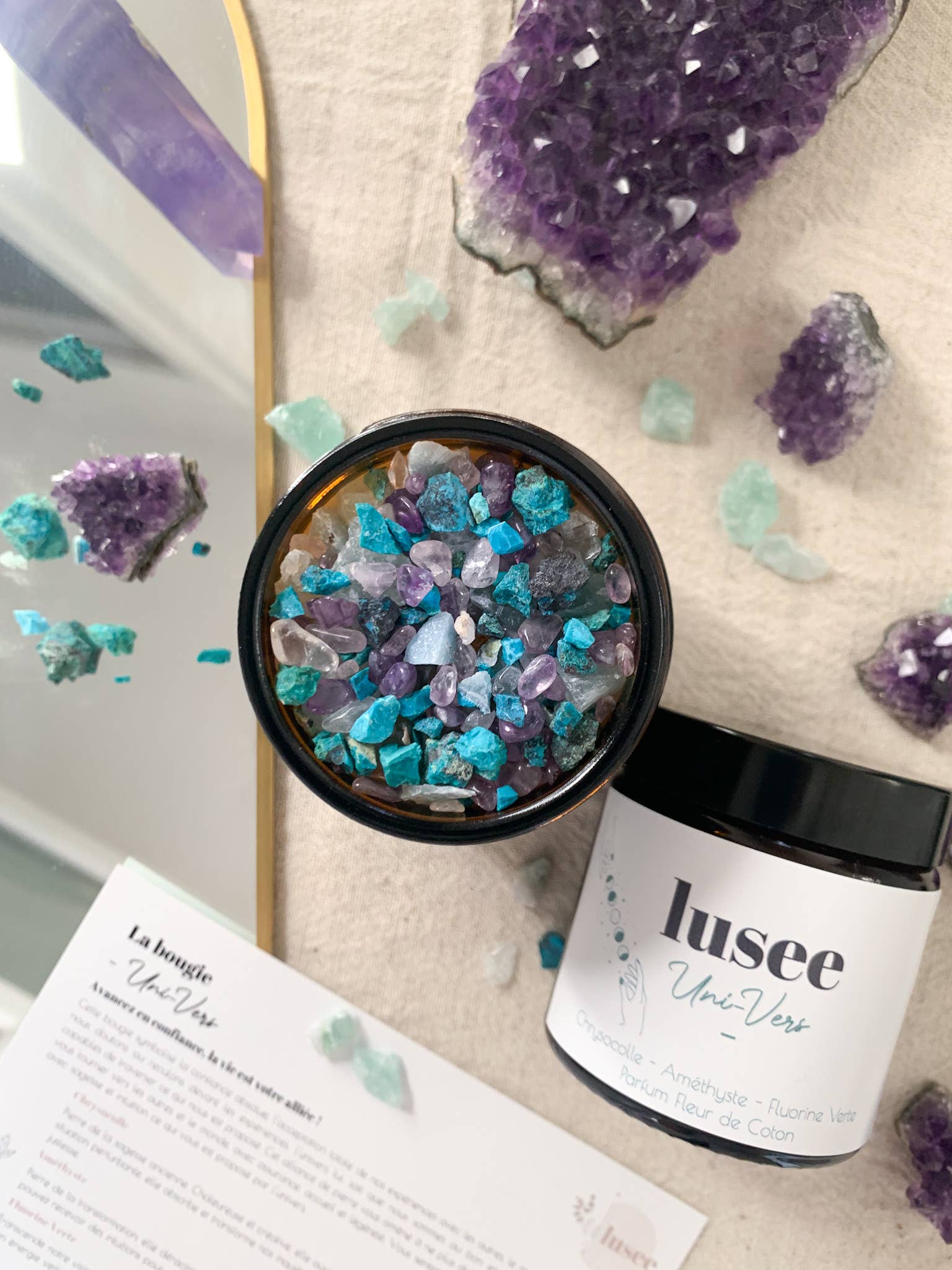"Och ljuset blev till!" ...är mantrat för Lusee, ett varumärke skapat av Lucie, en ljusmakare. Driven av den glada och djupa övertygelsen att allt redan finns inom oss, lanserade jag min onlinebutik 2021 för att stödja personliga utvecklingsvägar med värdefulla ljus. Idag lyser mina ljus upp för många kvinnor och män som söker att släppa taget, finna fred och harmoni på sin personliga väg. Och ljusen jag erbjuder bjuder var och en, genom sitt budskap, att återknyta till den mening man söker. Djupt engagerad i mänskliga relationer har jag gjort min butik till en mötesplats, en plats för respektfulla och varma utbyten där e-handel ger vika för vackra möten. Mina ljus gjuts hantverksmässigt i min verkstad som är full av värdefullhet, med 100% naturliga material. Jag väljer mina dofter som utvecklats i Grasse av en erkänd mästerparfymör som erbjuder essenser utan reproduktionstoxiska ämnen och utan CMR. Vaxerna är vegetabiliska, vekarna är av linne eller oblekt flätad bomull, och burkarna är återvinningsbara och kommer från Europa. Slutligen är Lusee också den privilegierade tillgången till en kvalitetskälla för stenar, utvalda av en känd fransk stenexpert.