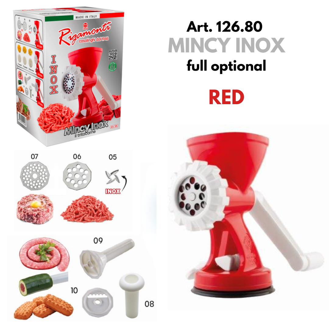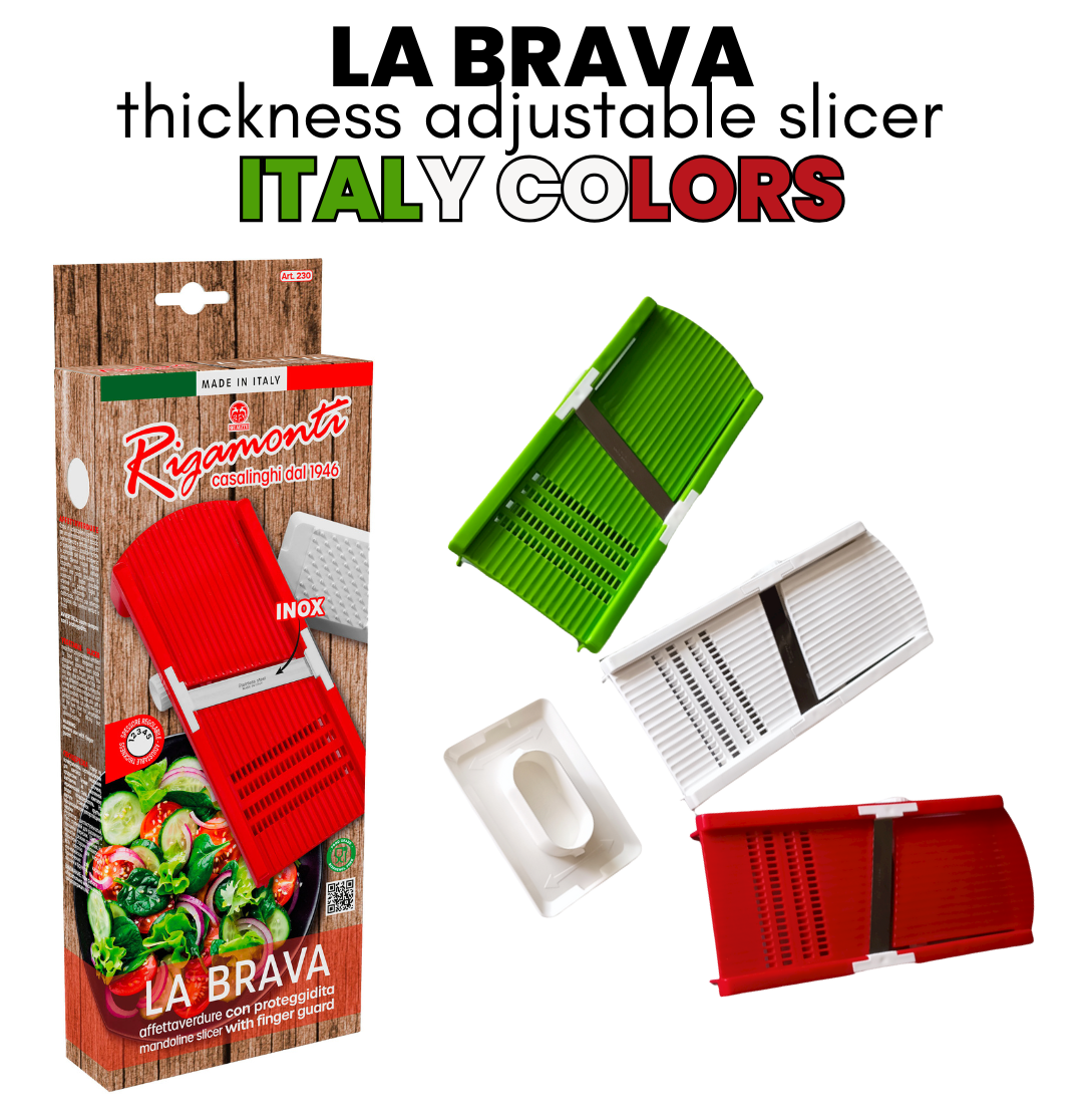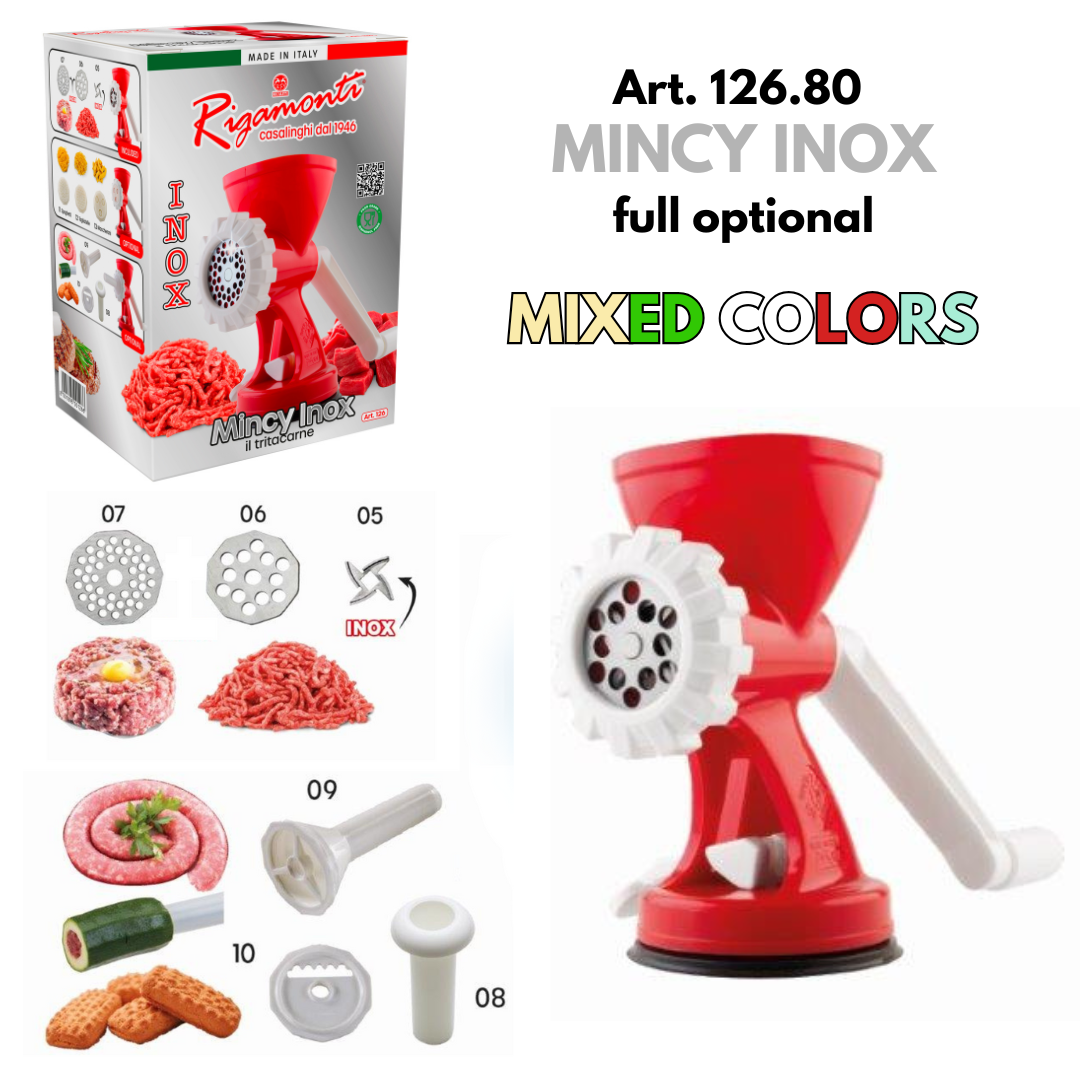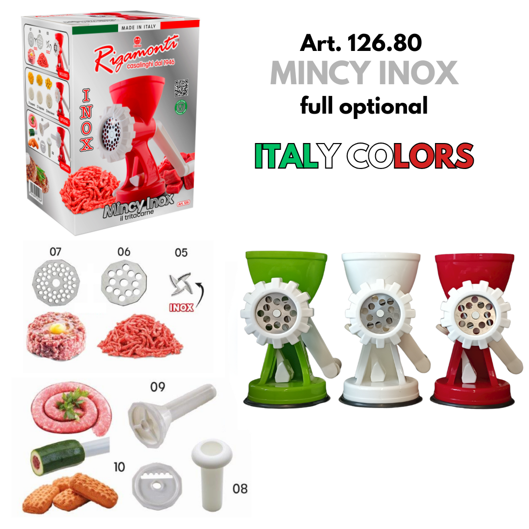 Omfattande erfarenhet och omfattande sortiment är världen för Rigamonti Pietro & Figli srl. Ett dynamiskt företag baserat i Lecco, som har designat och tillverkat handdrivna köksartiklar sedan 1946. Rigamontis sortiment är helt tillverkat i Italien. Det distribueras i stor utsträckning i Italien och exporteras över hela världen, från Europa till Nord- och Sydamerika, från Kina till Japan och Malaysia, från Egypten till Gulfstaterna. Den stora katalogen inkluderar tomatpressar, stora och små rivjärn, köttkvarnar, rivare, mandolinskivare, juicepressar, potatischipsmaskiner, hackare, skärbrädor, trattar, grönsaksskalare, konservöppnare, knivslipare, iskrossare, korkare, kapsylförslutare och mycket mer. Denna produktion uppskattas över hela världen för sin funktionalitet och för kvaliteten på de använda materialen. Resultatet av ständig, noggrann uppdatering och förfining, Rigamontis köksredskap genomgår regelbundna, strikta tester för att verifiera deras tillförlitlighet och effektivitet. De uppfyller alla EC:s krav på livsmedelssäkerhet. De är miljövänliga eftersom de inte använder någon energikälla. De är lätta att rengöra och kan helt demonteras för en noggrann diskning. De tål maskindisk. När de förvaras tar de inte upp mycket plats i köket.