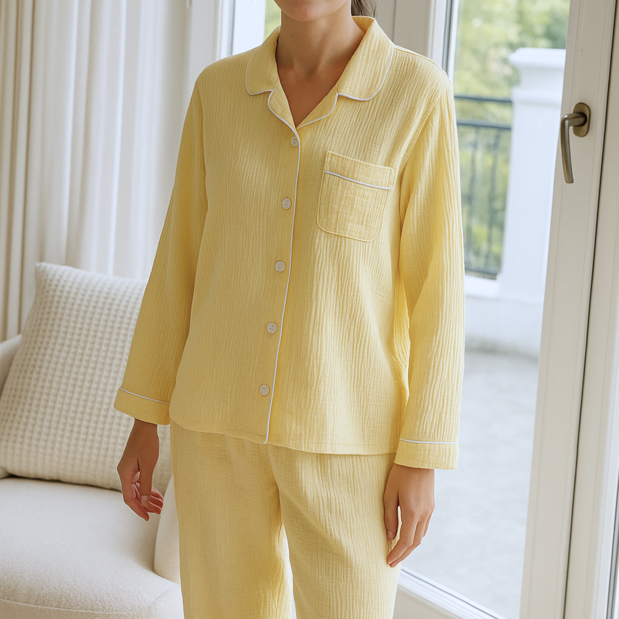 Tillverkad av mjuk dubbelgasväv i bomull, detta andningsbara linne-set har en inbyggd bh, justerbara axelband och en flödande passform—perfekt för avslappnad avkoppling eller som present. Ett lätt blommönster och volangkant ger en charmig, vintage känsla. Tillverkat av 100% högkvalitativ bomull med dubbelvävd gasväv, erbjuder detta set oöverträffad mjukhet, fukttransporterande andningsförmåga och en knappt märkbar känsla. Linnet inkluderar en lätt stödjande inbyggd bh och justerbara axelband för bekvämlighet hela dagen. Tillsammans med rymliga, högmidjade shorts är det ett idealiskt val för spabutiker, hemmakollektioner eller sommarpresentset. Skötsel: Skonsam handtvätt, hängtorkas, blek ej. Stryk på låg värme om det behövs.