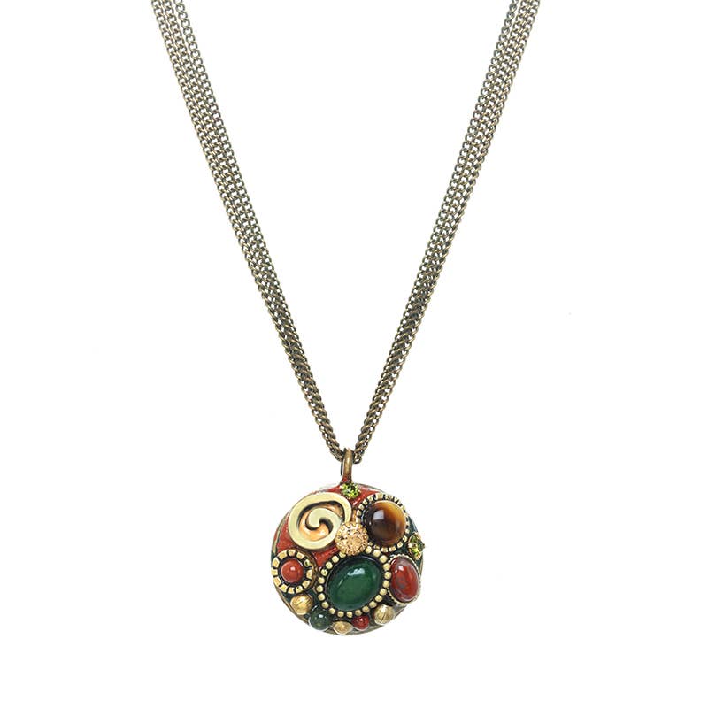 Material: Swarovski kristaller, glas cabochons. Metall: 24k guld elektropläterad över mässing. Storlek: Kedja justerbar 16 x 20 inches, hänge 1,5 inches lång. Hummer klo lås. Handgjord i vår NYC studio. Gratis presentförpackning.